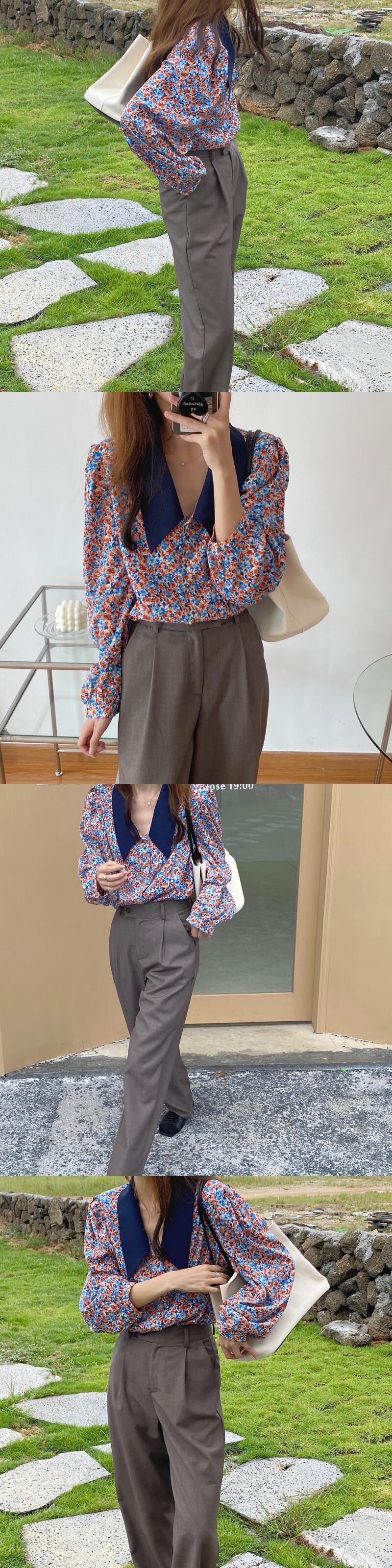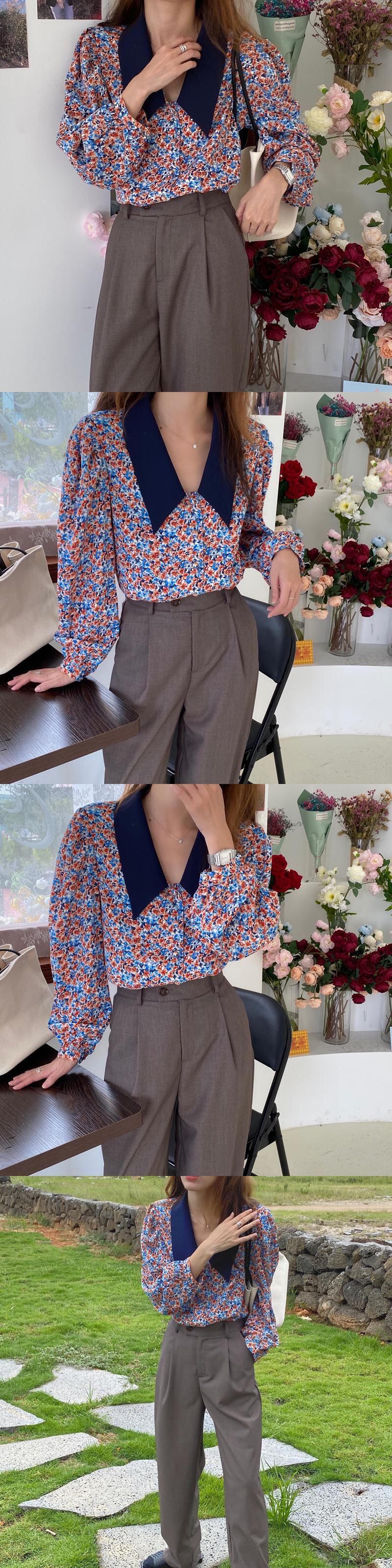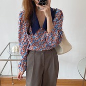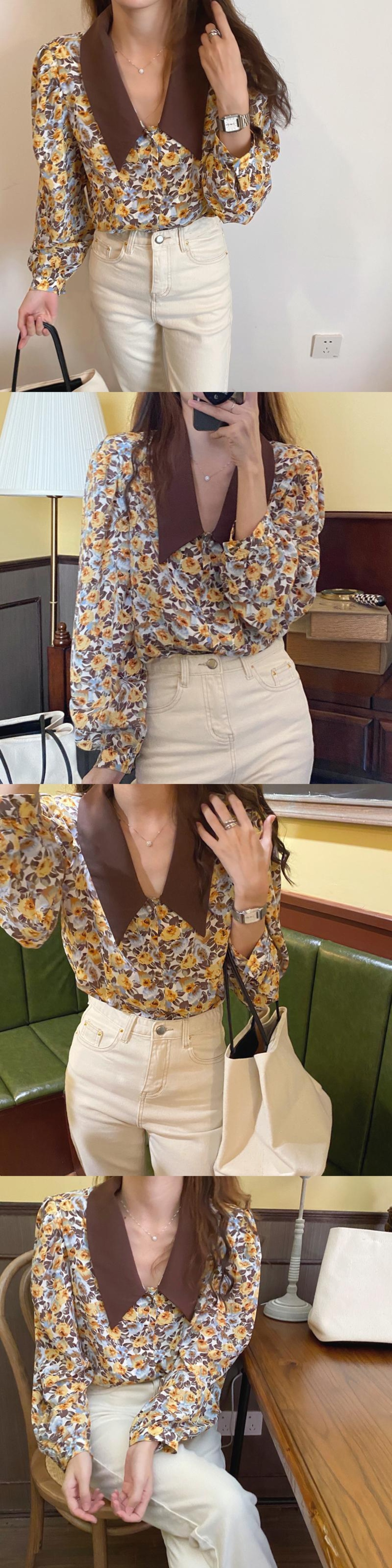 韓国ファッションスタンダード秋物カラーフローラルブラウス シャツ レディース ロング レトロ 大人ガーリー スウィート キュート カジュアル オータム 花柄 ステッチ 長袖 muzly74197787470 | Neatly