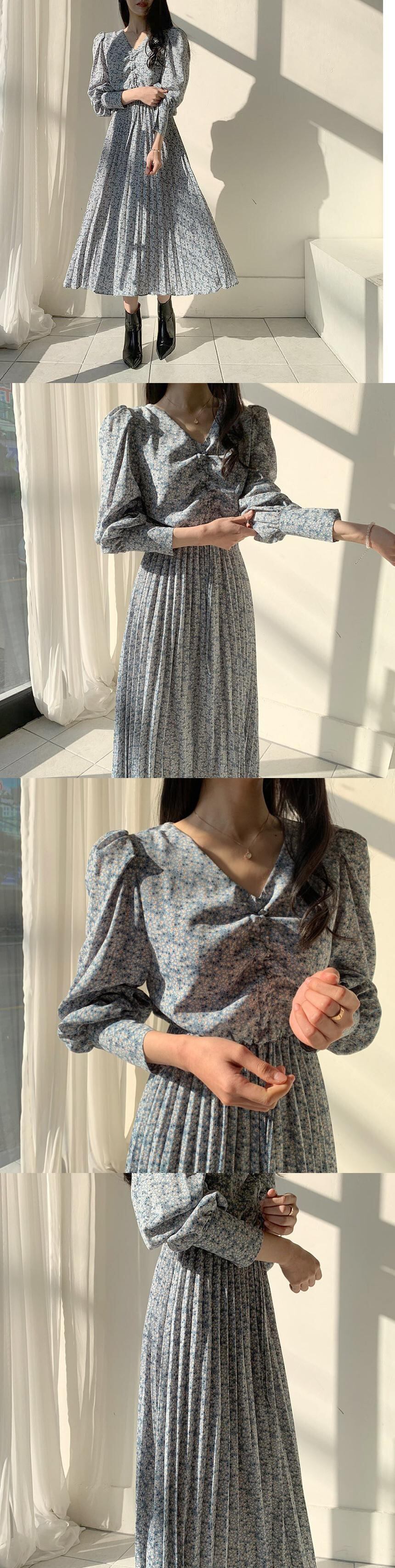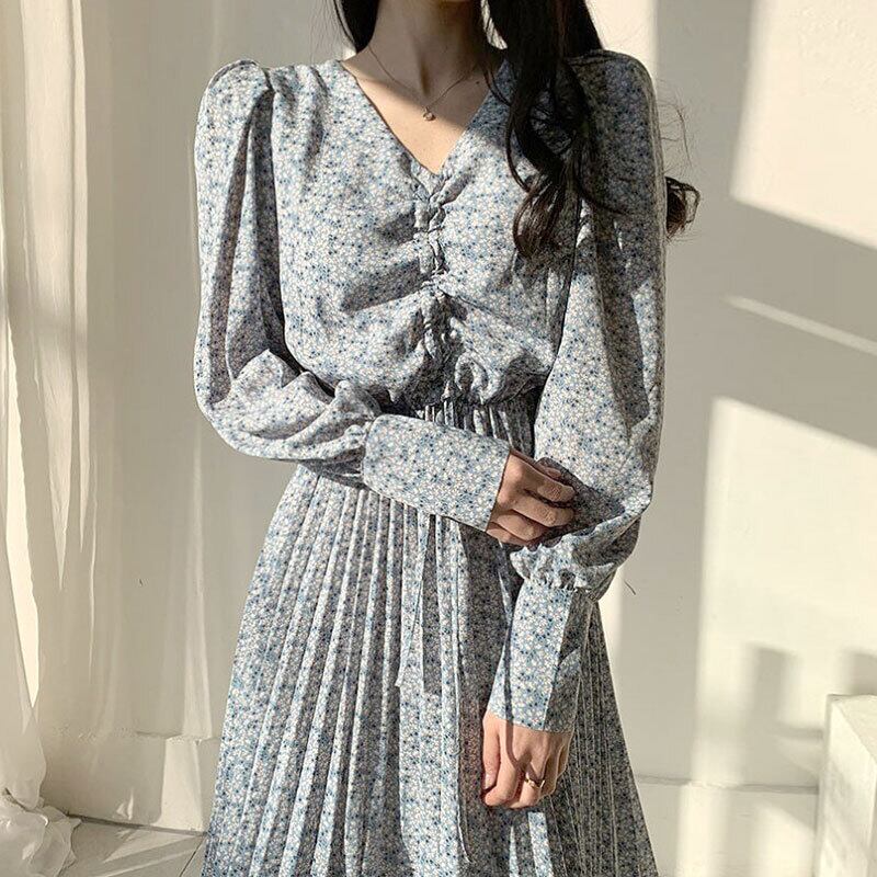 韓国ファッションスプリングスタンダードプリーツVネックロングフローラルスカート ウェストワンピース レトロ 大人ガーリー スウィート キュート カジュアル 春物 花柄 長袖 ウエスト muzly66919172864 | Neatly