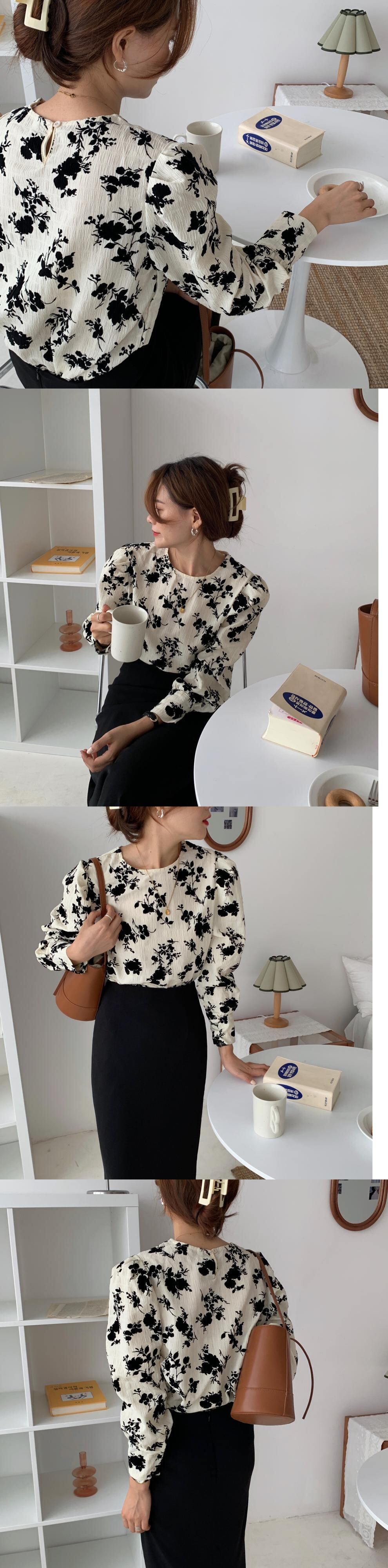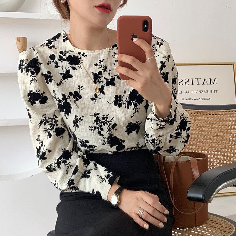 秋物スタンダードFlowerデザイン ラウンドネックプルオーバー シャツ トップス レディース ロング レトロ オータム Oネック フラワーデザイン 長袖 muzly82554534392 | Neatly
