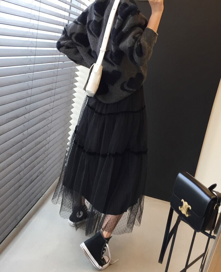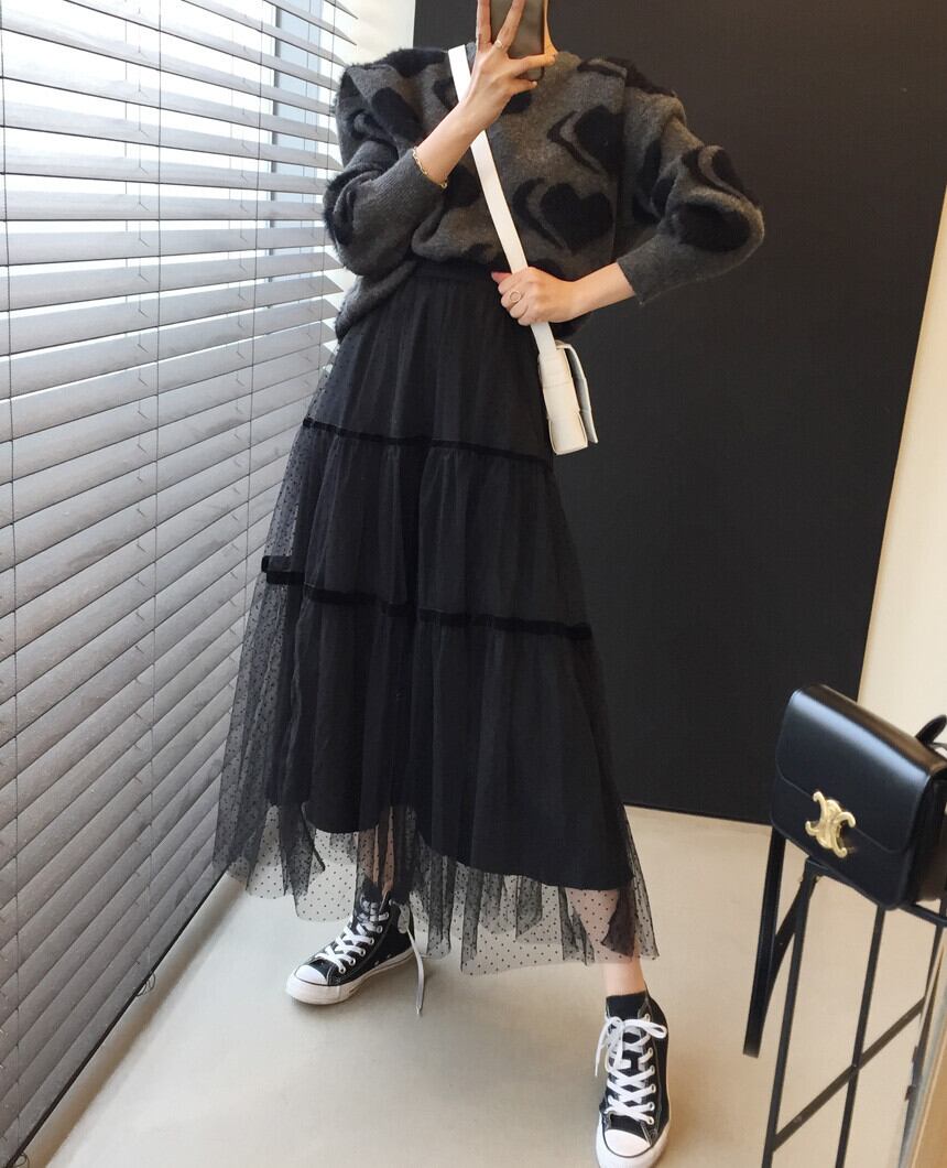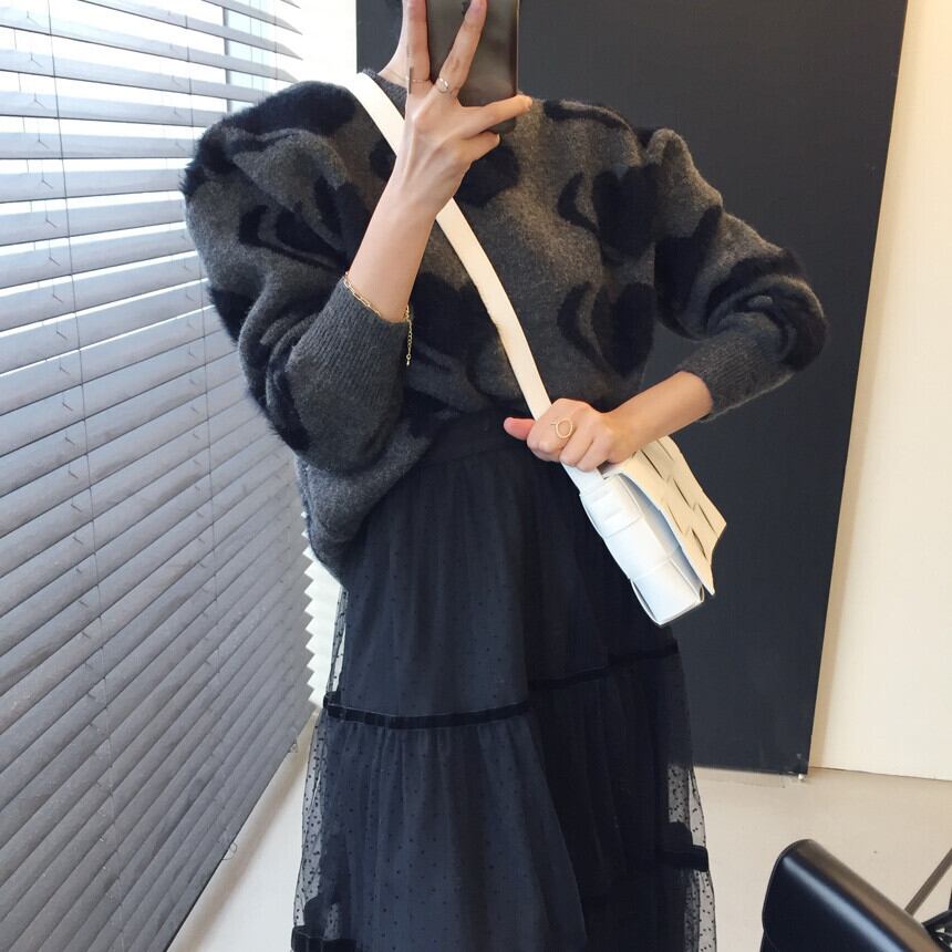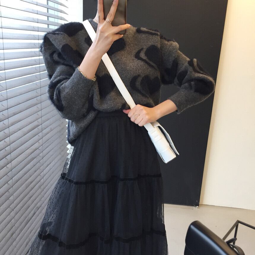 韓国ファッションNEWウィンターラウンドネックニットルーズセーター ハイウェストメッシュスカート レディース ロング ふわふわ 冬物 Oネック 長袖 ウエスト muzly54050997107 | Neatly