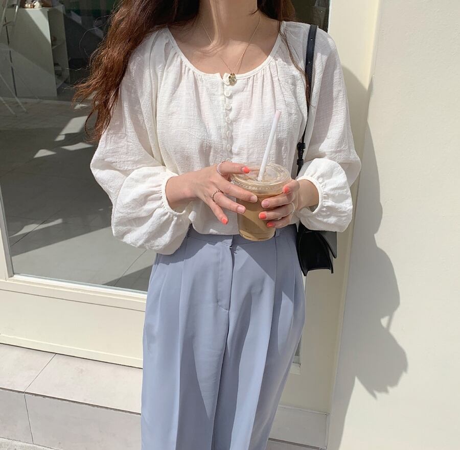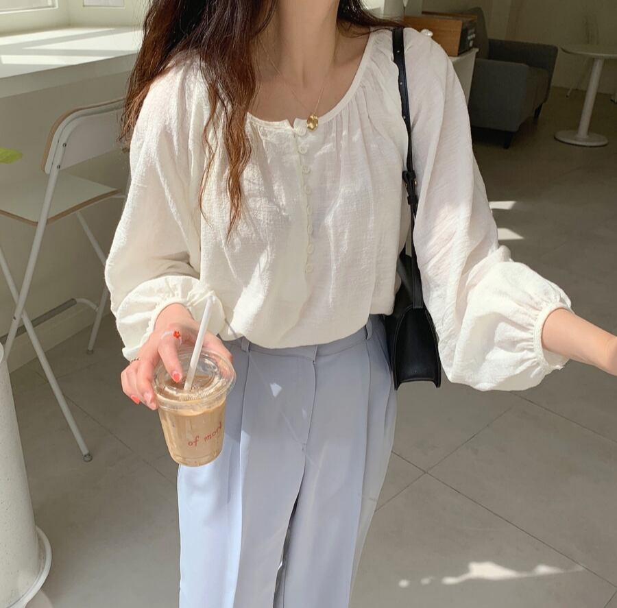 韓国ファッション夏服ラウンドネックホワイトルーズプリーツシャツ トップス レディース ロング 大人ガーリー スウィート キュート カジュアル 夏物 Oネック 長袖 muzly63713336036 | Neatly