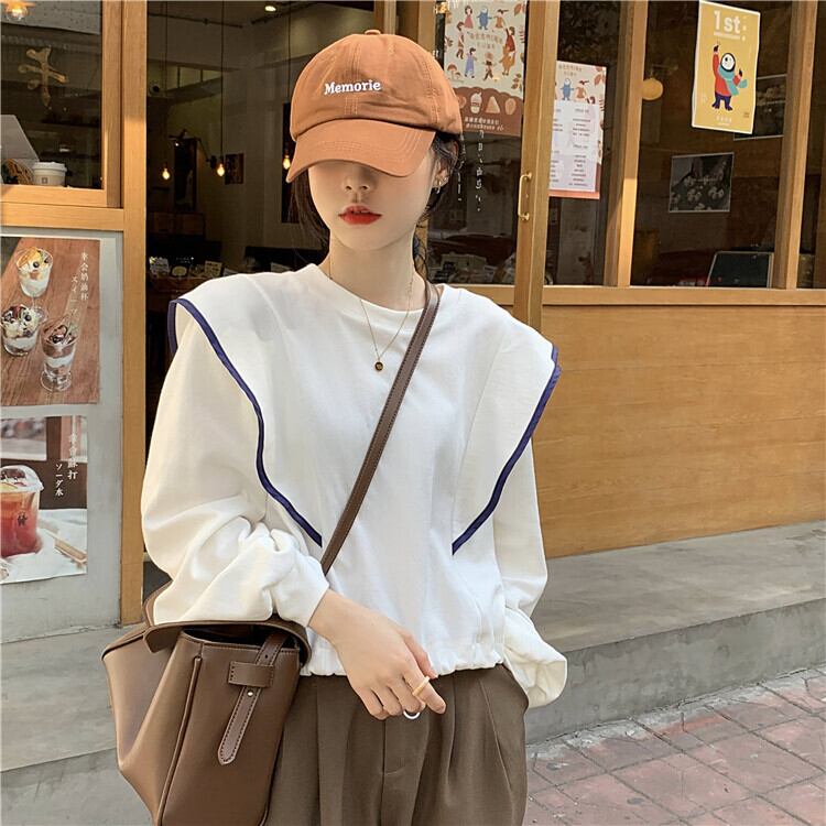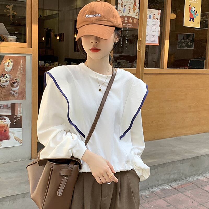 NEW秋物ルーズラウンドネックカラースリーブトップス ギャザー長袖Tシャツ ロング 大人ガーリー スウィート キュート カジュアル オータム Oネック muzly92869927863 | Neatly