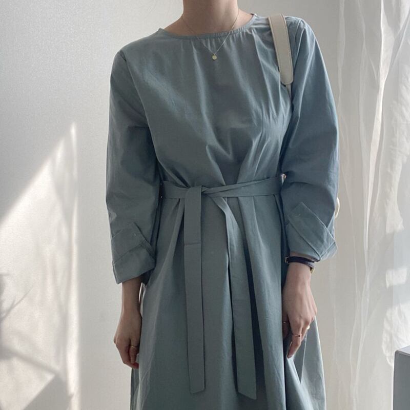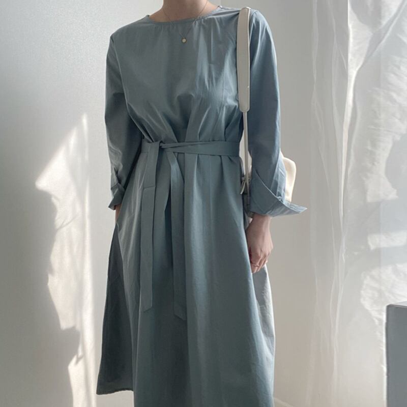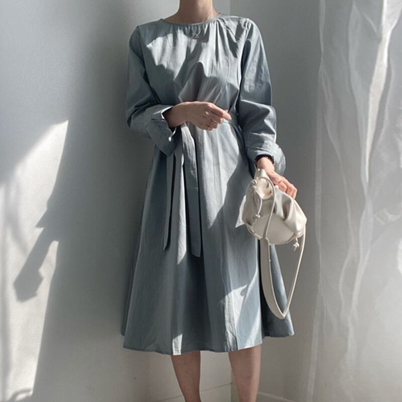 秋物ソリッド カラーラウンドネックスカート ウェストワンピースレディース ロング レース オータム Oネック レースアップ ソリッドカラー 長袖 ウエスト muzly58614717422 | Neatly