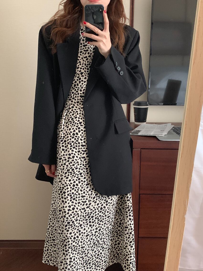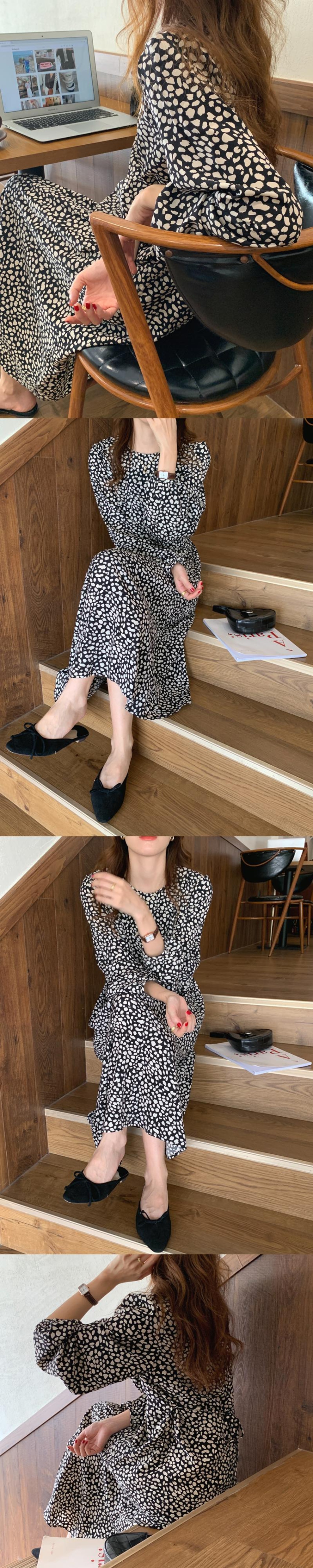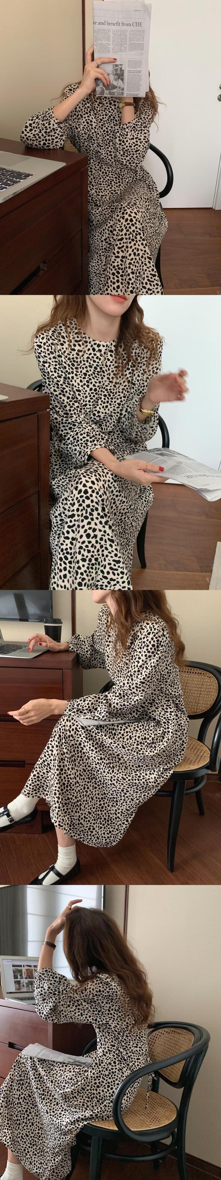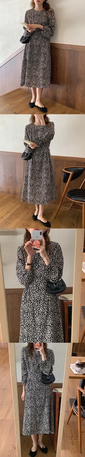 韓国ファッション秋物ラウンドネックスリーブワンピースウェスト長袖レオパードプリント柄レディース ロング ランタンスリーブ オータム Oネック ウエスト ミドル丈 muzly37296924759 | Neatly