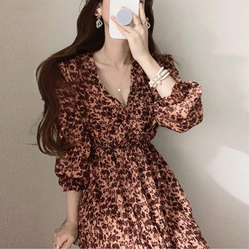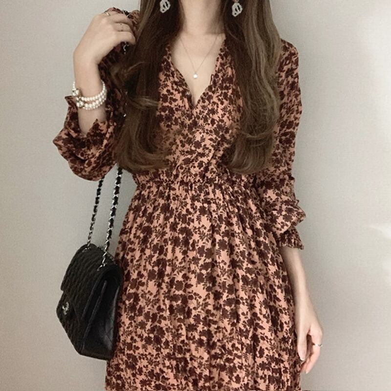 韓国ファッションスタイルスプリングプリーツVネックロングフローラルスカート ワンピース 大人ガーリー スウィート キュート カジュアル 春物 花柄 長袖 muzly6277066272 | Neatly