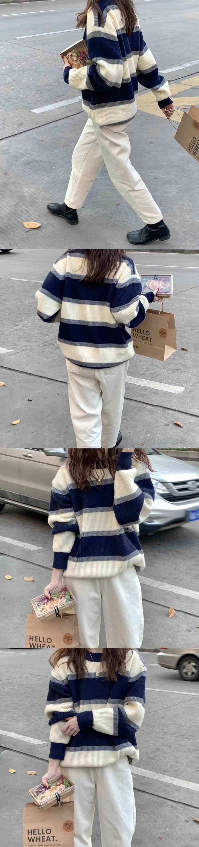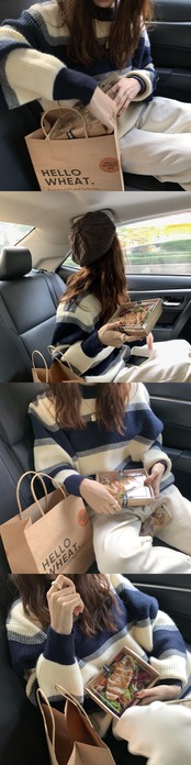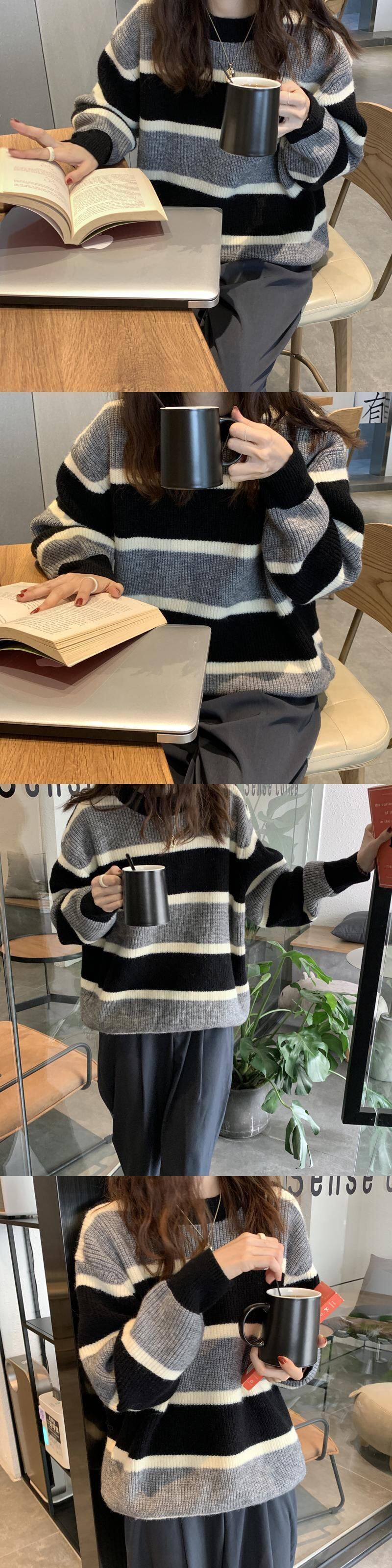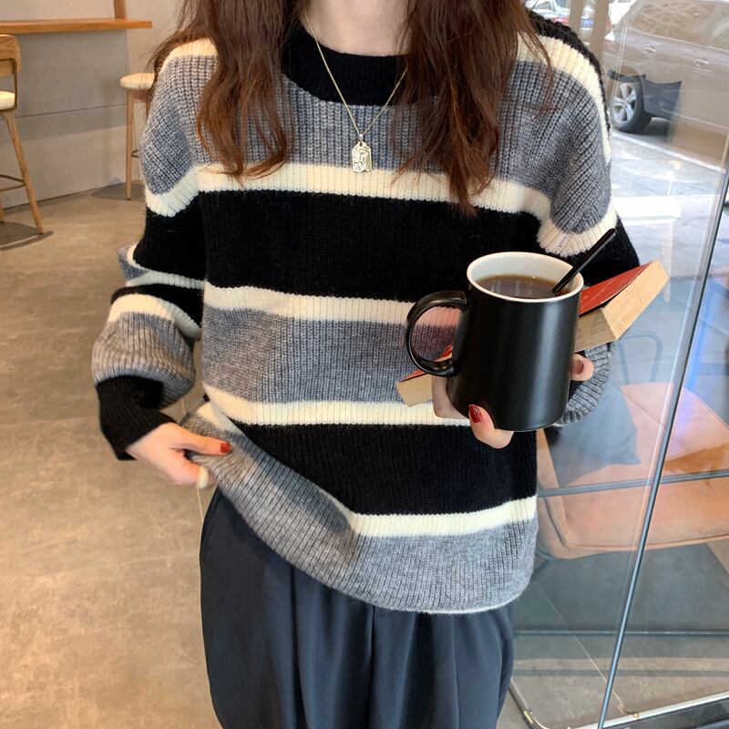 韓国ファッションウィンタースタンダードラウンドネックカラープルオーバー ブラウス ルーズストライプセーター レディース ロング レトロ 冬物 Oネック 長袖 muzly45047919804 | Neatly