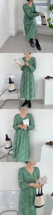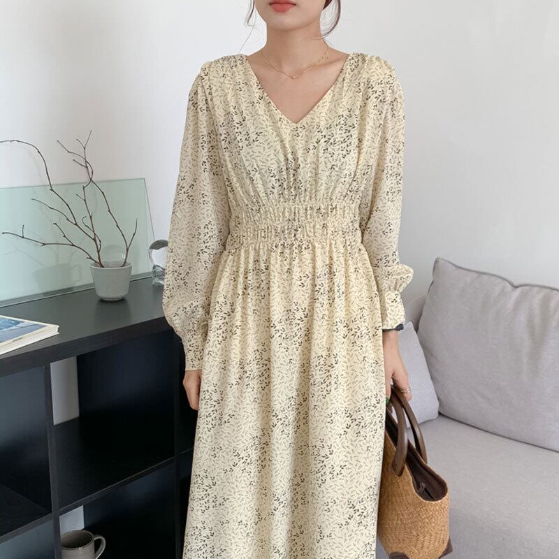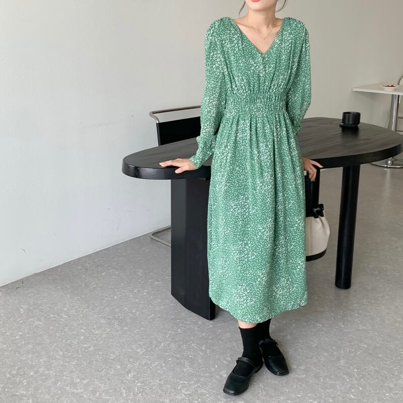 韓国ファッションNEW秋物Vネックフローラルスカート ストレッチウェストハイウェストスリムワンピース ロング エラスティック 伸縮 オータム 花柄 長袖 ウエスト ミドル丈 muzly18880128201 | Neatly
