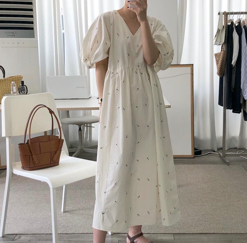 韓国ファッションNEW夏服Vネックパフスリーブスリーブルーズロングフローラルハイウェストウェスト薄手ミニ ワンピースワンピースレディース レッド 刺繍 夏物 花柄 スタイル ウエスト muzly998424276 | Neatly