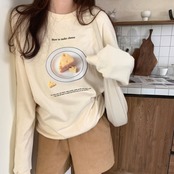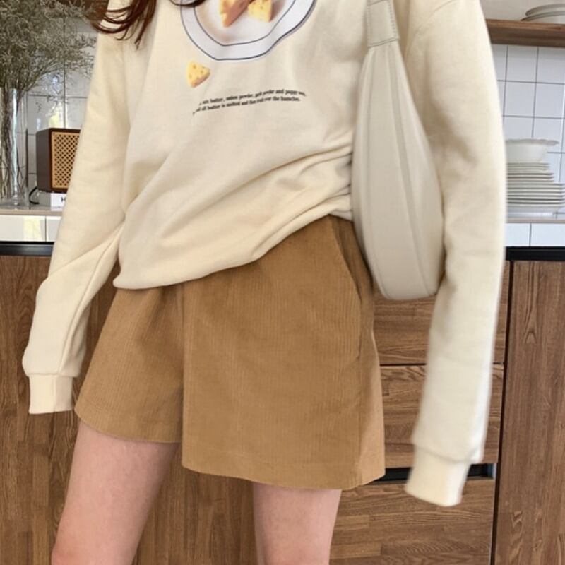 色:グレーの厚手のコットンT,ベージュのセーター,ブルーショートパンツ,ブラウンショートパンツ