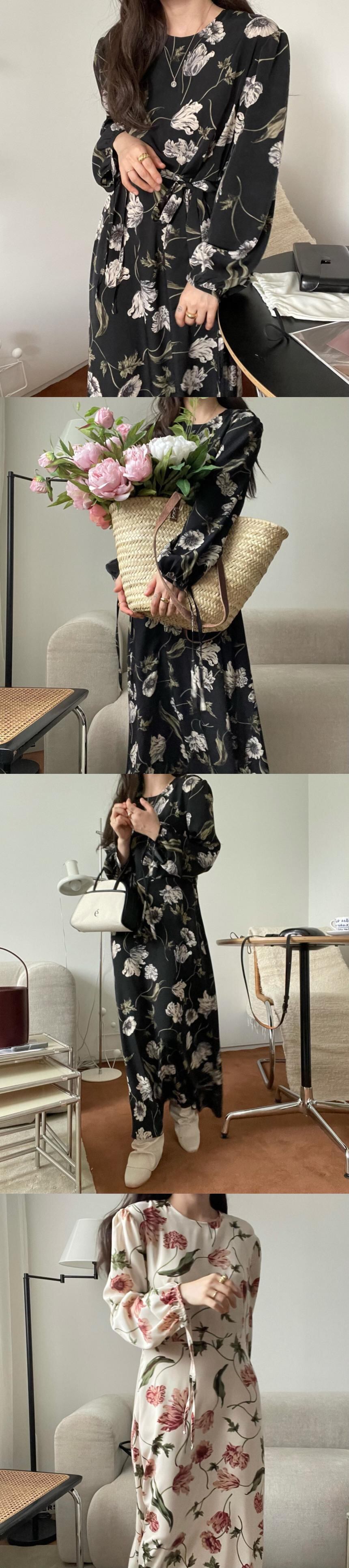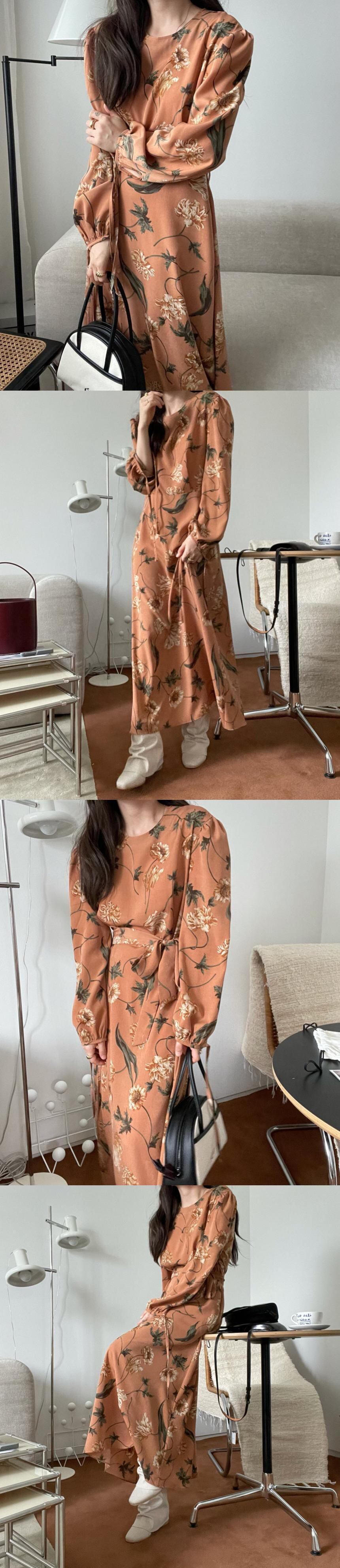 韓国ファッション秋物スタイルラウンドネックロングスカート ウェストフローラルワンピースレディース エレガント オータム 花柄 Oネック パフスリーブ 長袖 ウエスト muzly39020849464 | Neatly