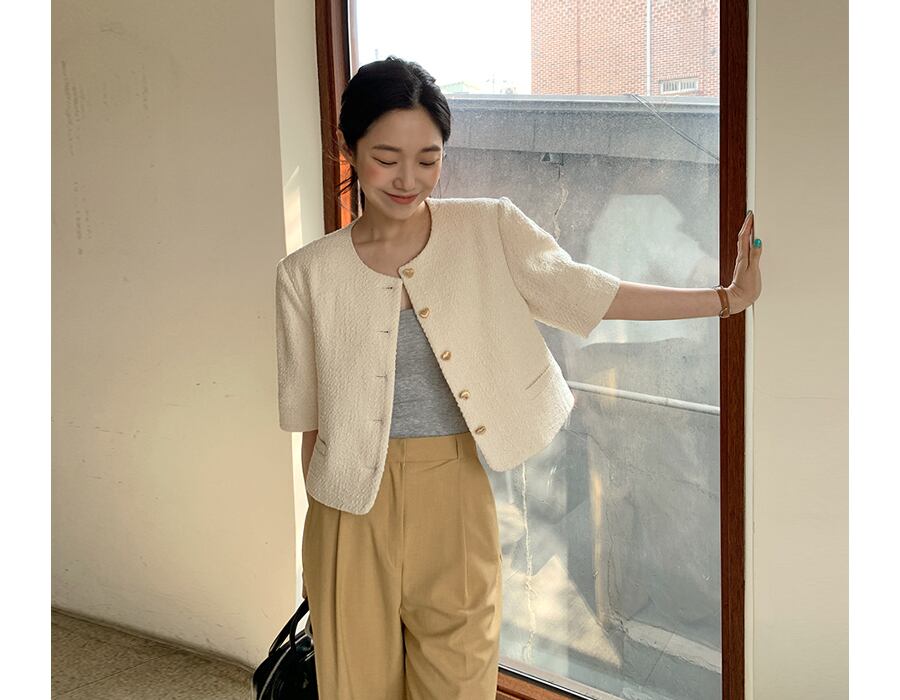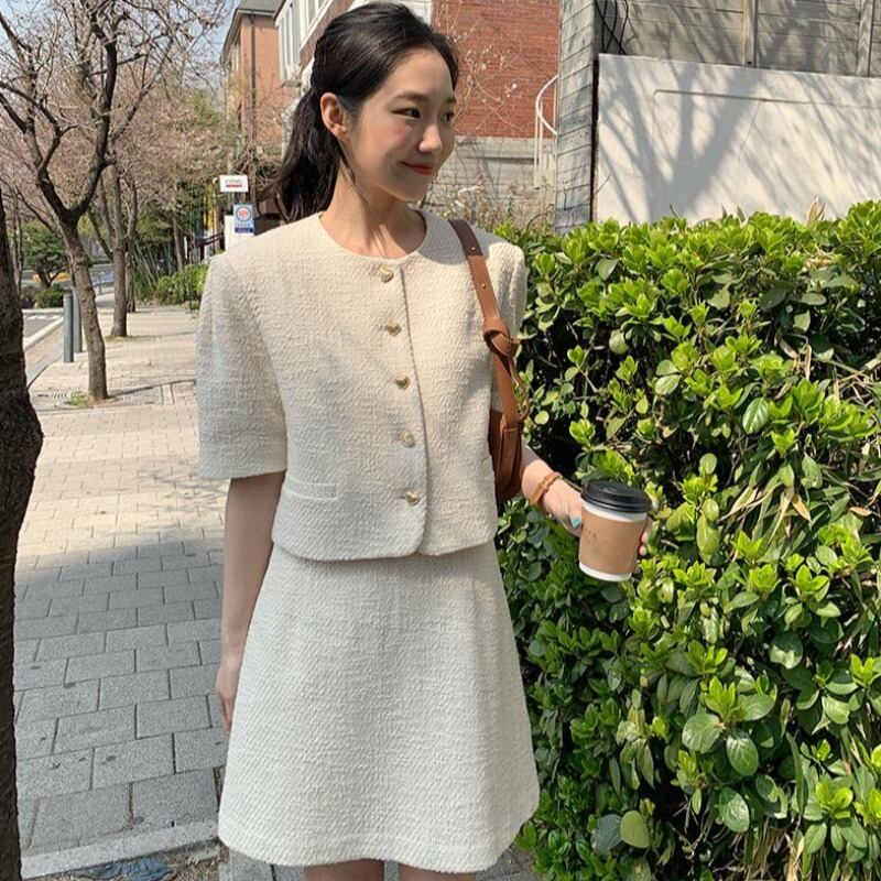 韓国ファッション夏服ラウンドネックツィードショート半袖スリーブジャケット ハイウェストウェストスリムAラインスカート ハーフスリーブ 夏物 Oネック ウエスト muzly4387193239 | Neatly