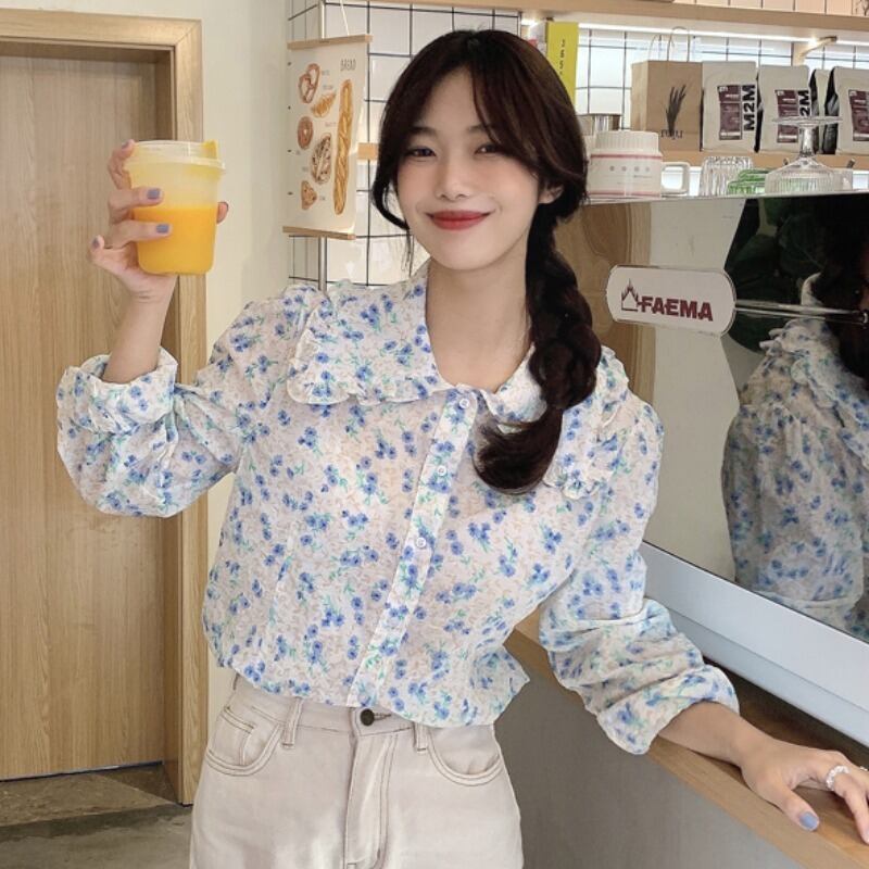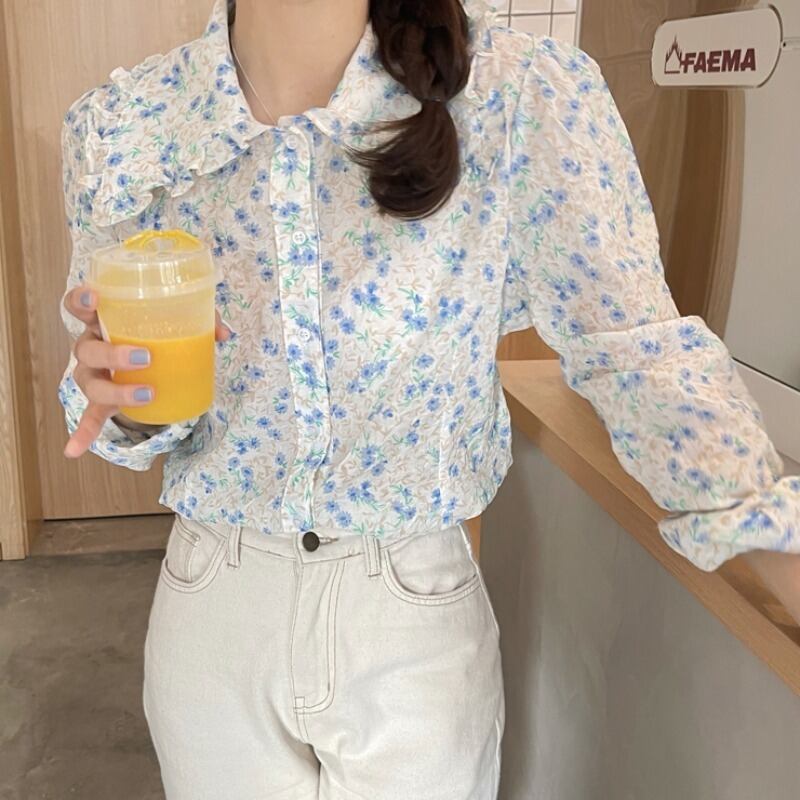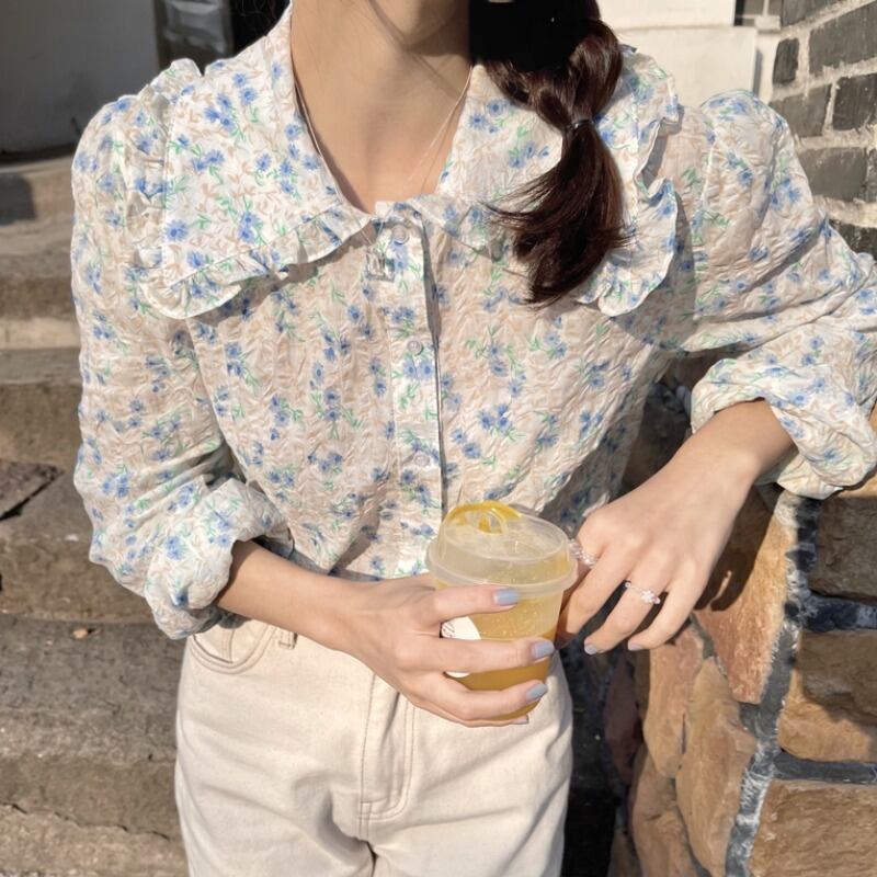 韓国ファッションスプリングカラーシャツ 薄手Flowerデザイン 大人ガーリー スウィート キュート カジュアル 春物 フラワーデザイン パフスリーブ muzly67525505213 | Neatly