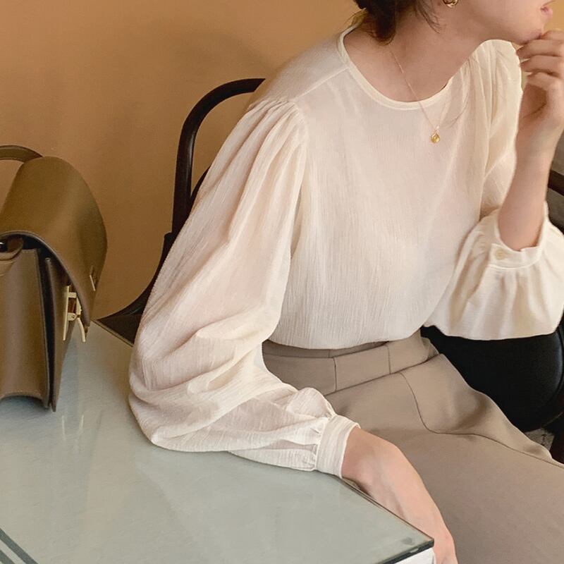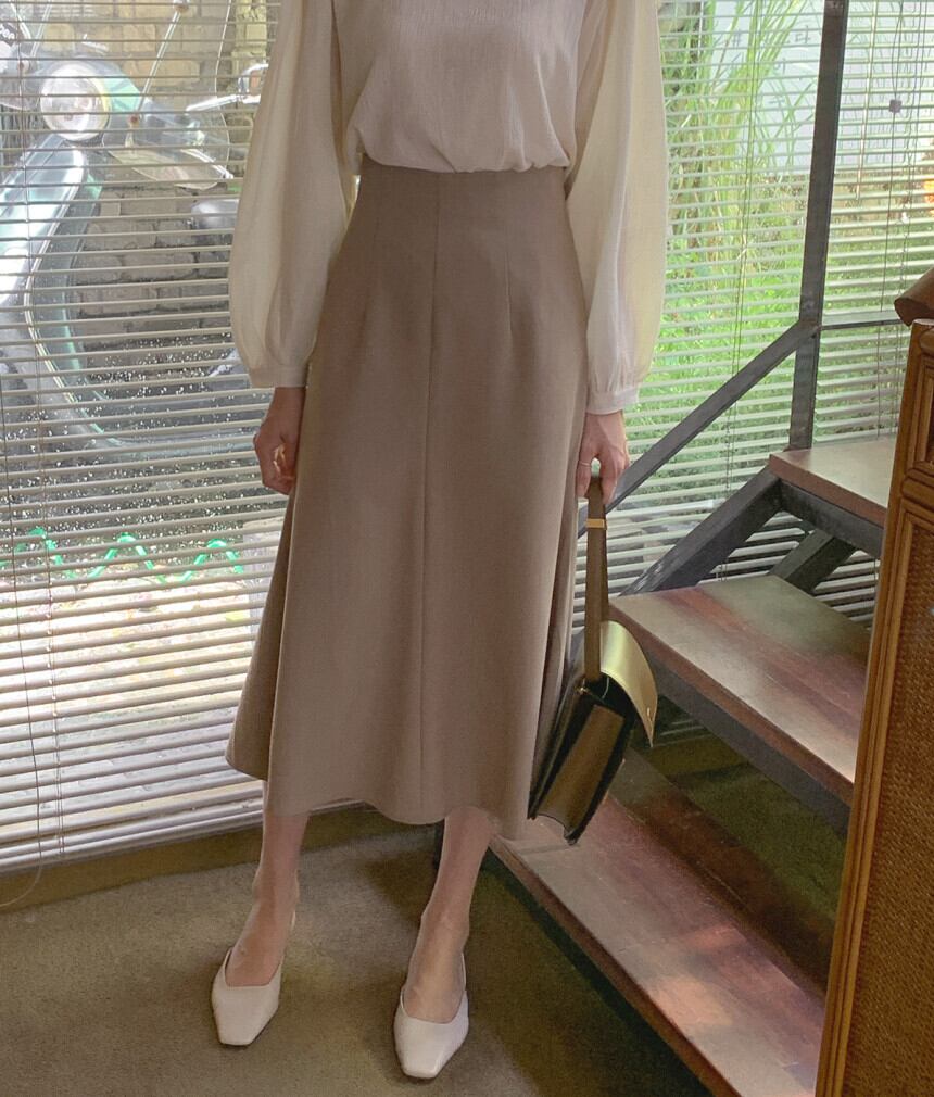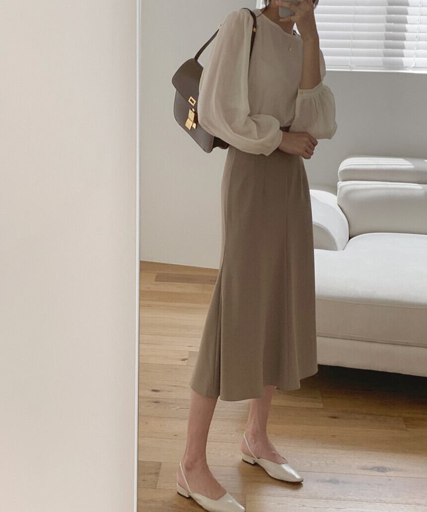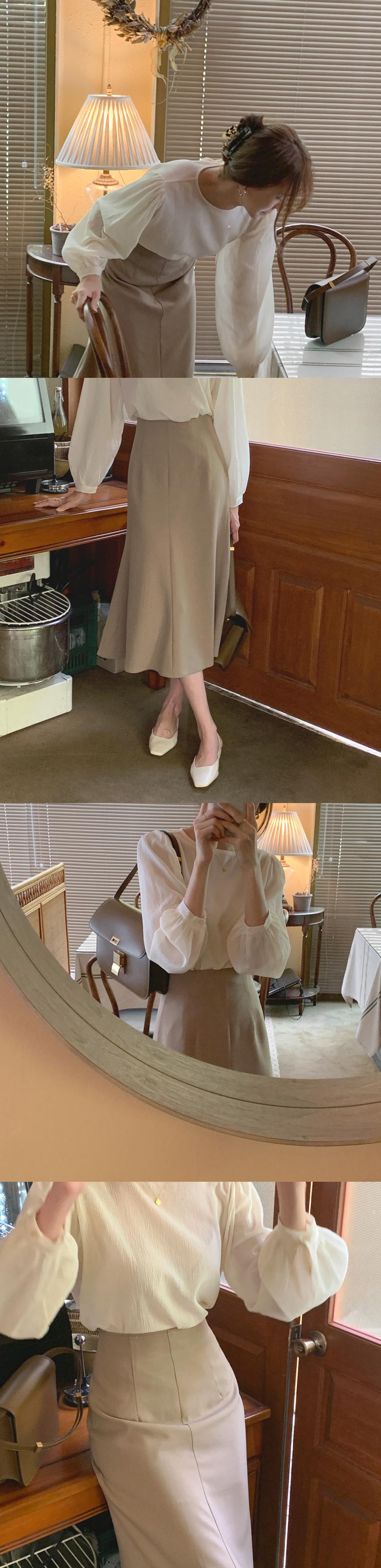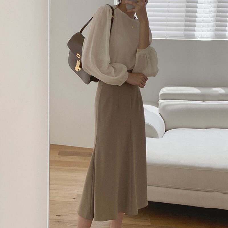 韓国ファッションNEWスプリングルーズラウンドネックシャツ 薄手ハイウェストスカート ロング 大人ガーリー スウィート キュート カジュアル 春物 Oネック 長袖 ウエスト ミドル丈 muzly13477070218 | Neatly