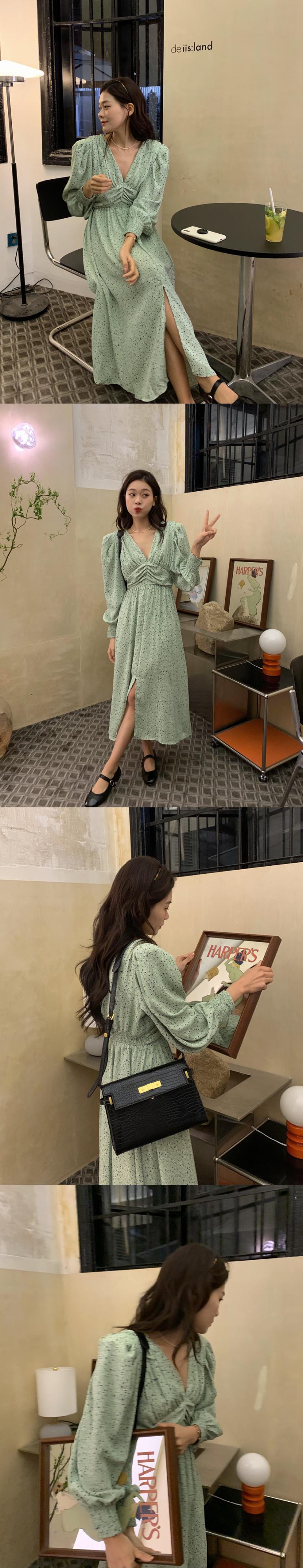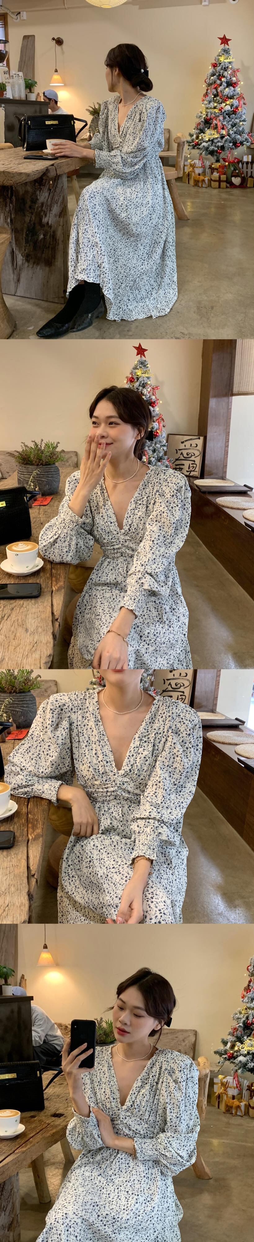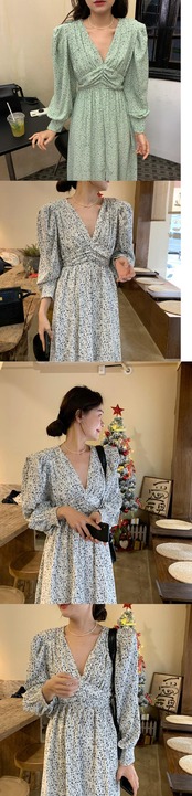 韓国ファッションNEWスプリングVネックフローラルスカート スタンダードプリーツウェストシフォンワンピース ロング レトロ 春物 花柄 長袖 ウエスト muzly43479875839 | Neatly