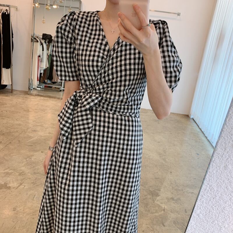 韓国ファッションNEW夏服スタンダード格子柄スカート ウェスト薄手ミニ ワンピースワンピースレディース レトロ レース 夏物 レースアップ ウエスト muzly17993855261 | Neatly