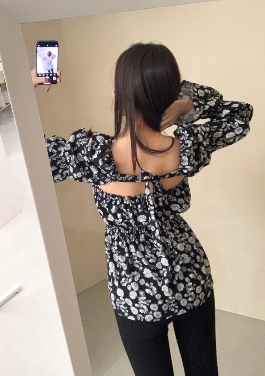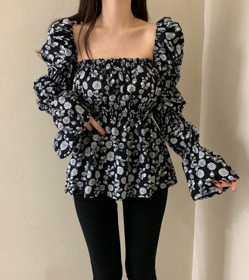韓国ファッションスプリングスタンダードシャツ Flowerデザイン ストレッチウェストスリーブレディース ランタンスリーブ レトロ エラスティック 伸縮 春物 フラワーデザイン スクウェア ウエスト muzly29010909767 | Neatly