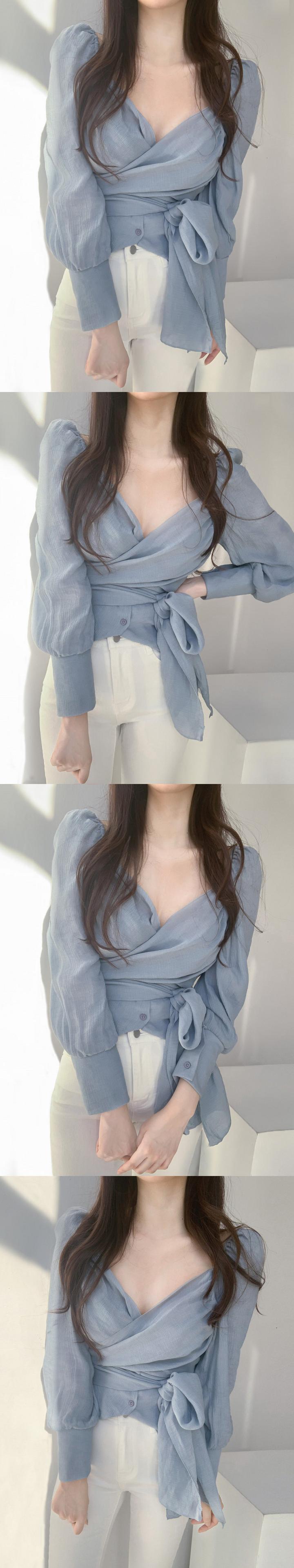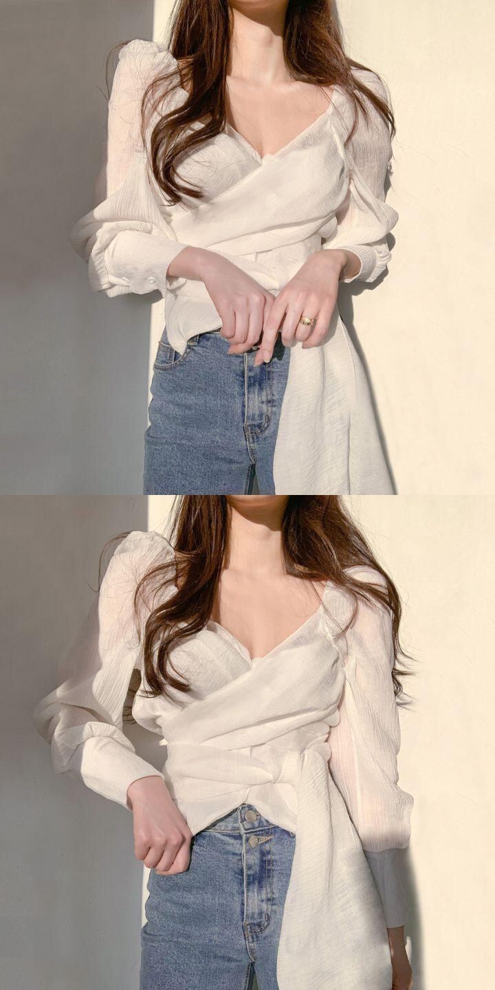 韓国ファッションNEW秋物Vネックショートプリーツバンドウェストシャツ トップス レディース 大人ガーリー スウィート キュート カジュアル オータム パフスリーブ ウエスト muzly87087951707 | Neatly