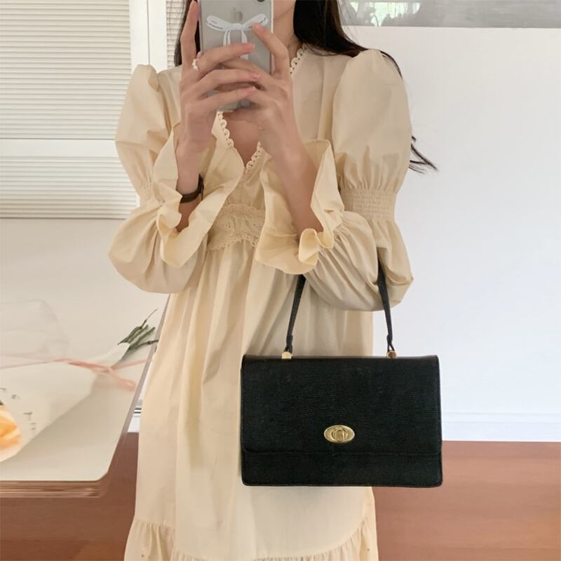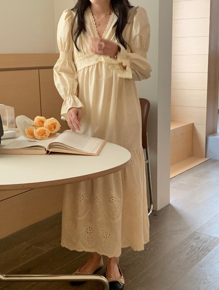 韓国ファッションNEWスプリングスタンダード刺繍Vネックロングスカート ルーズハイウェストウェストスリム長袖スリーブワンピースレディース レトロ 春物 ウエスト muzly78162524228 | Neatly