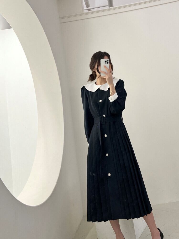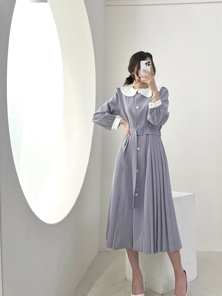 韓国ファッションスプリングスタンダードカラーホワイトウェストプリーツワンピース ロング レトロ 大人ガーリー スウィート キュート カジュアル 春物 長袖 ウエスト ミドル丈 muzly12343680961 | Neatly