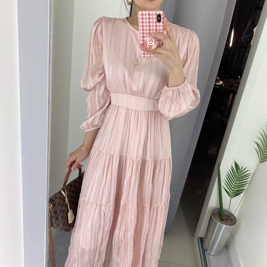 韓国ファッション秋物ラウンドネックロングスカート ウェストプリーツ長袖スリーブワンピース 大人ガーリー スウィート キュート カジュアル オータム Oネック ウエスト muzly67630701811 | Neatly