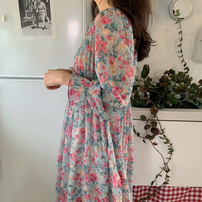 韓国ファッションスプリングフローラルスカート プリーツラウンドネックウェストワンピースレディース ロング 春物 花柄 Oネック 長袖 ウエスト ミドル丈 muzly38324837522 | Neatly