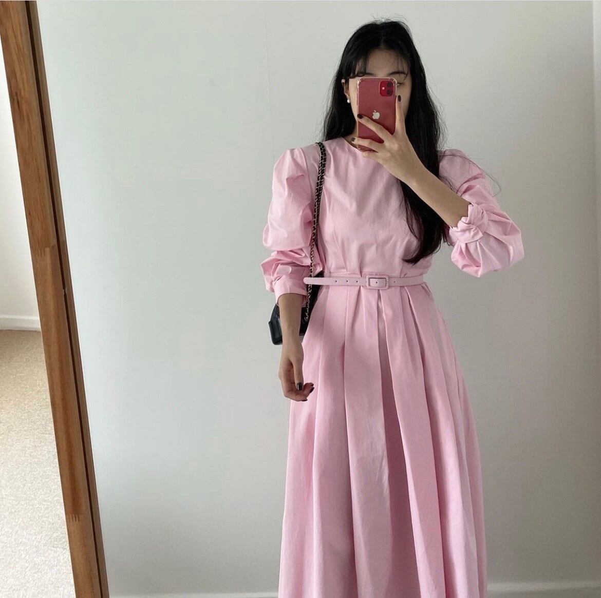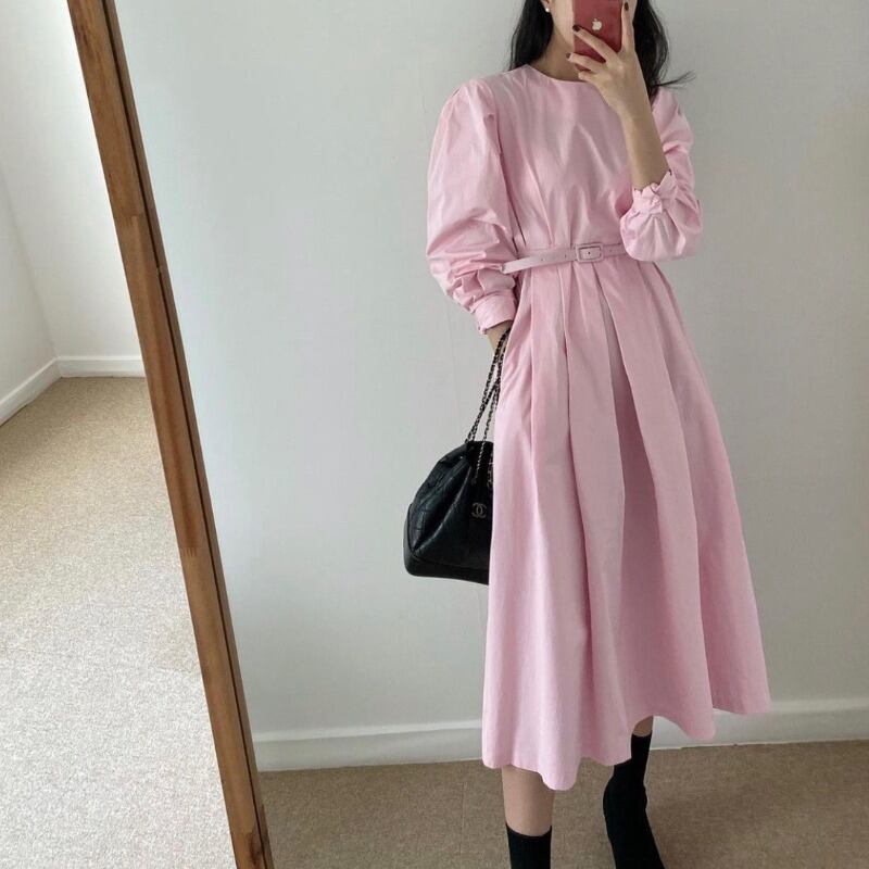 韓国ファッションスプリングスタンダードラウンドネックスリーブシャツ スカート ウェストプリーツワンピース レトロ 春物 Oネック ウエスト ミドル丈 muzly36251522087 | Neatly