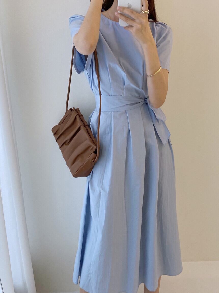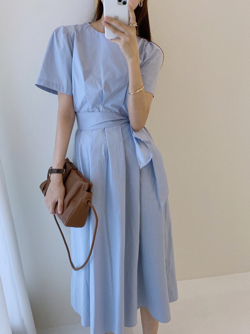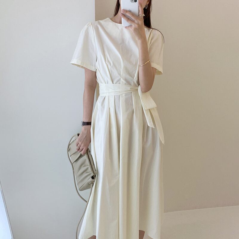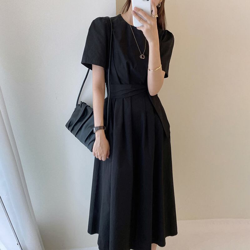 韓国ファッション夏服スタンダードソリッド カラーラウンドネックプリーツストラップ ウェストミニ ワンピースワンピース レトロ 夏物 Oネック ソリッドカラー ウエスト ミドル丈 muzly99721592473 | Neatly