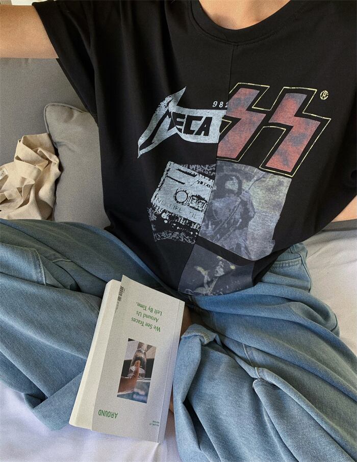 韓国ファッションNEWスプリングベーシックラウンドネックプルオーバー カジュアルプリントルーズTシャツトップス レディース 春物 Oネック ミドル丈 muzly18964276019 | Neatly