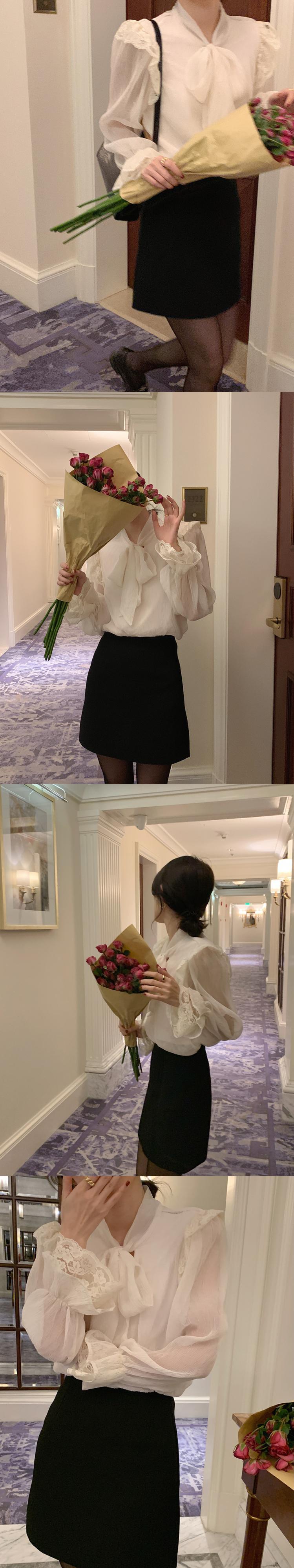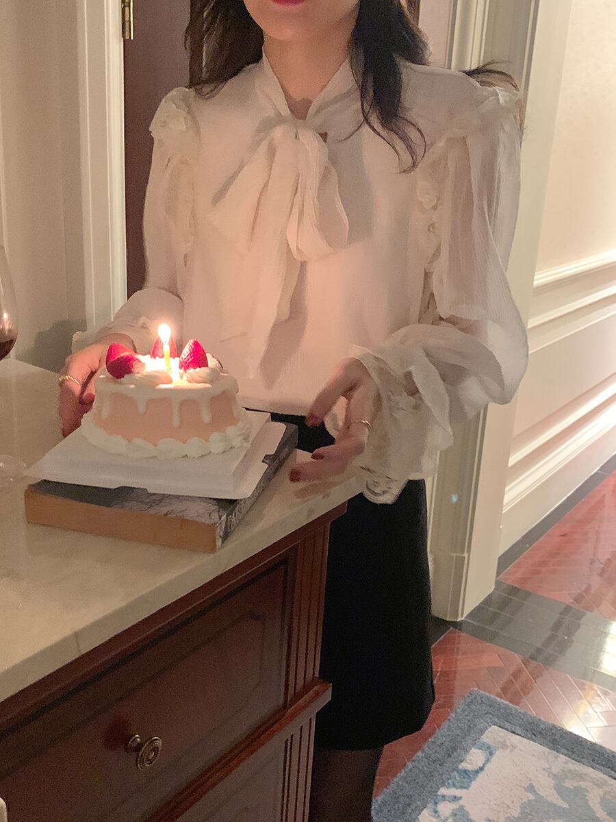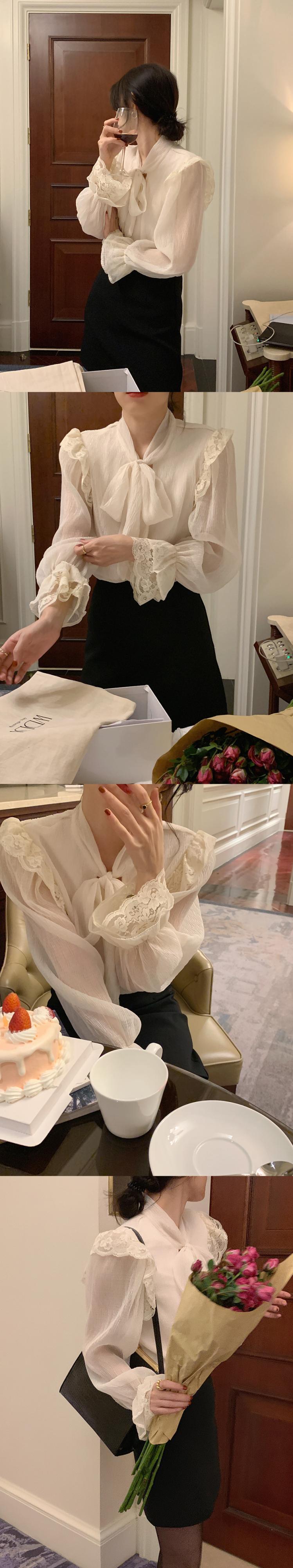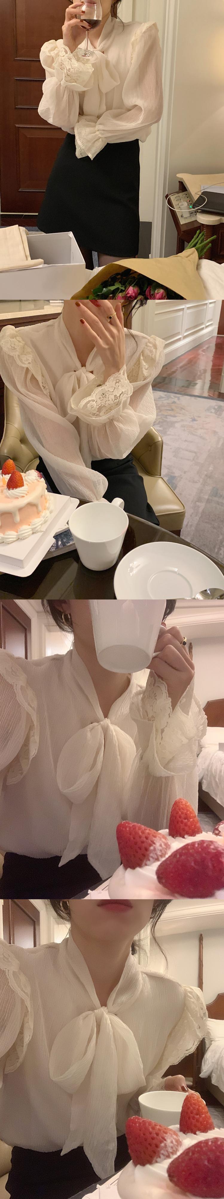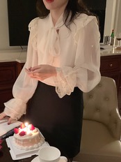 韓国ファッション秋物リボンレースプリーツシャツ トップス レディース ロング 大人ガーリー スウィート キュート カジュアル オータム ステッチ 長袖 muzly85221135612 | Neatly