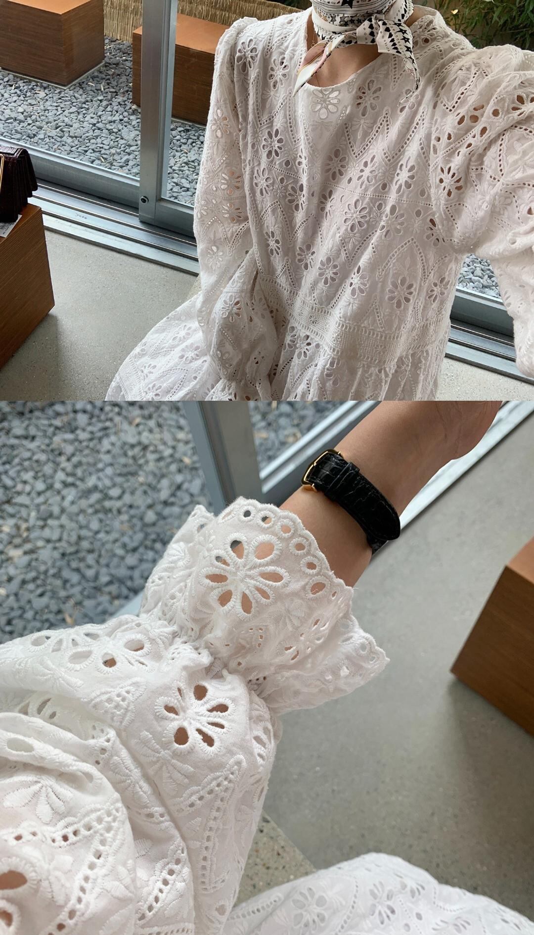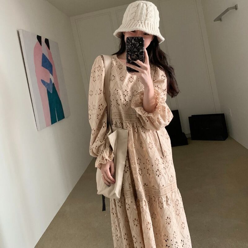 韓国ファッションスプリングスタンダードラウンドネックFlowerデザイン ロングスカート ルーズ薄手ワンピースレディース レトロ 春物 Oネック フラワーデザイン 長袖 muzly8831501003 | Neatly