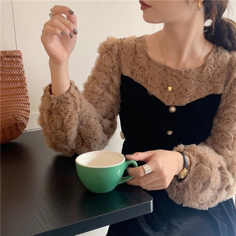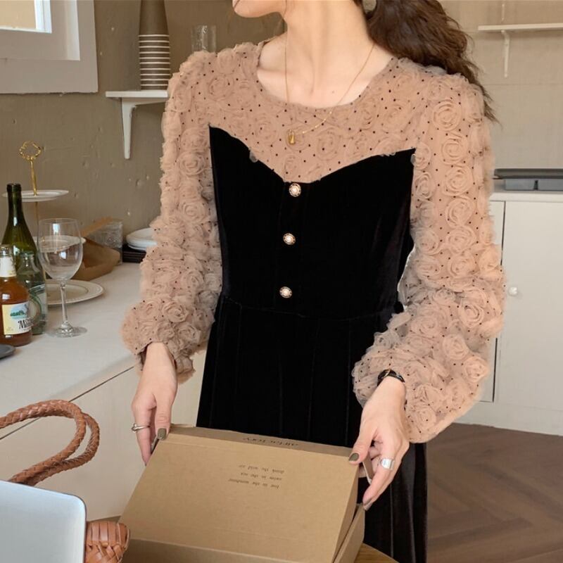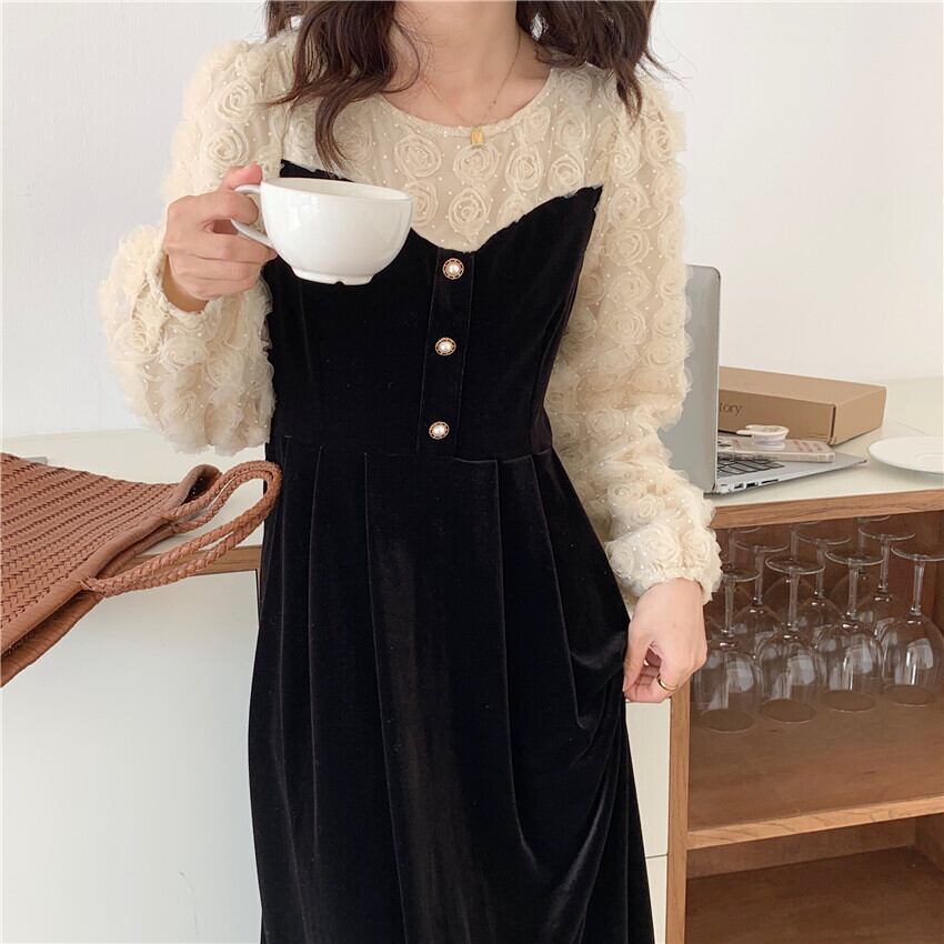 韓国ファッションスプリングスタンダードレーススタンドカラーカラーFlowerデザイン ロング厚みワンピース レトロ 春物 フラワーデザイン ステッチ 長袖 muzly64713620772 | Neatly