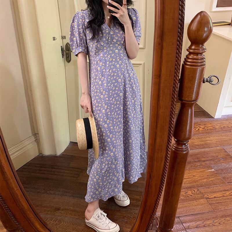 韓国ファッションNEW夏服スタンダードVネックスリーブフローラルロングスカート ウェストミニ ワンピースワンピースレディース レトロ 夏物 花柄 ウエスト muzly41844875266 | Neatly