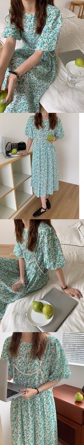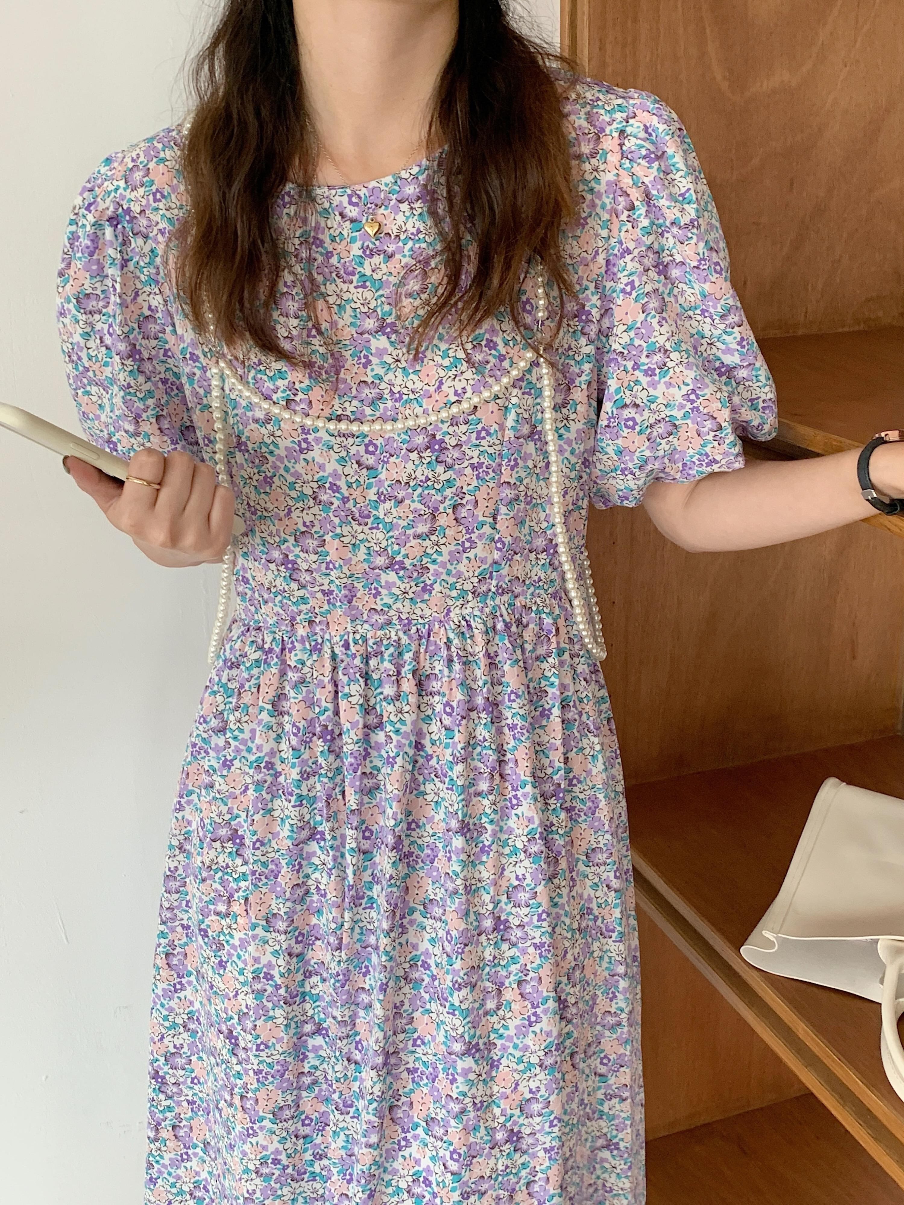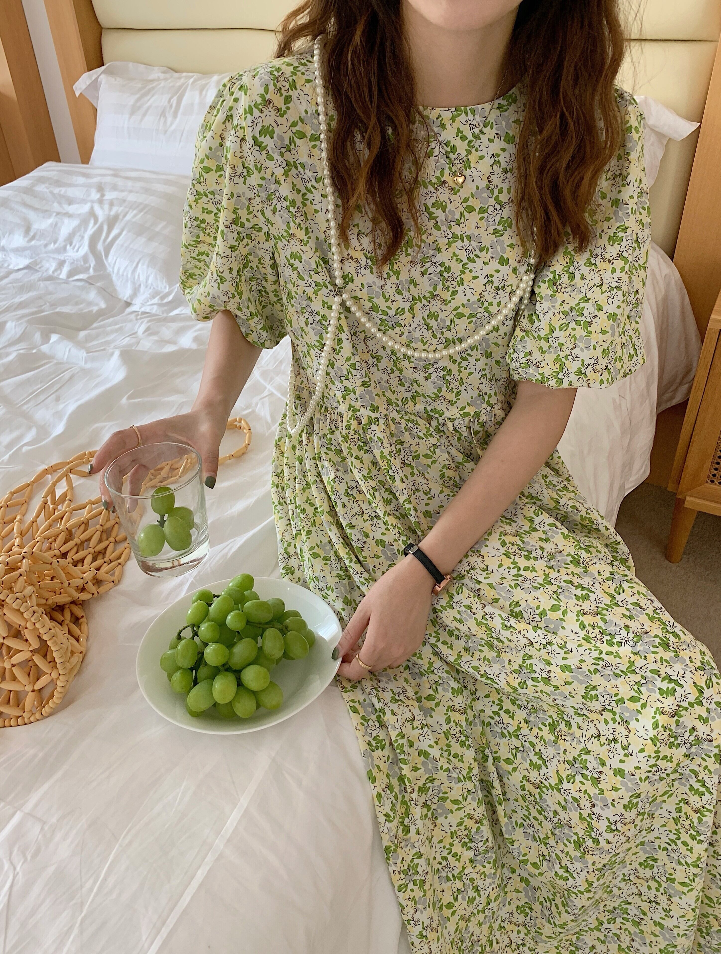韓国ファッション夏服スタンダードパールチェーン スリーブフローラルロングスカート ウェスト薄手ミニ ワンピースワンピースレディース レトロ 夏物 花柄 真珠 ウエスト muzly22592852758 | Neatly