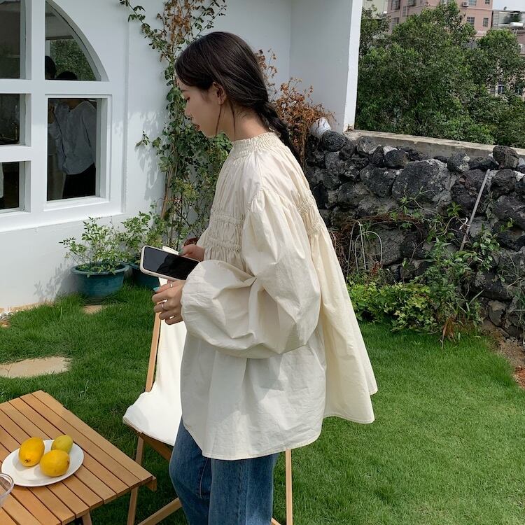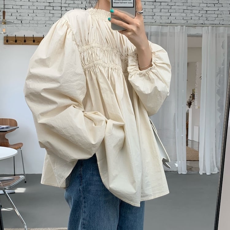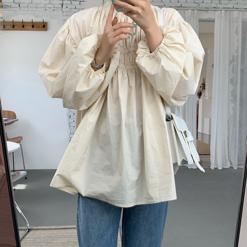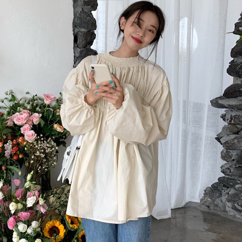 韓国ファッション秋物スタンダードプリーツラウンドネックルーズシャツ トップス スリーブ レトロ 大人ガーリー スウィート キュート カジュアル オータム Oネック muzly38764187401 | Neatly