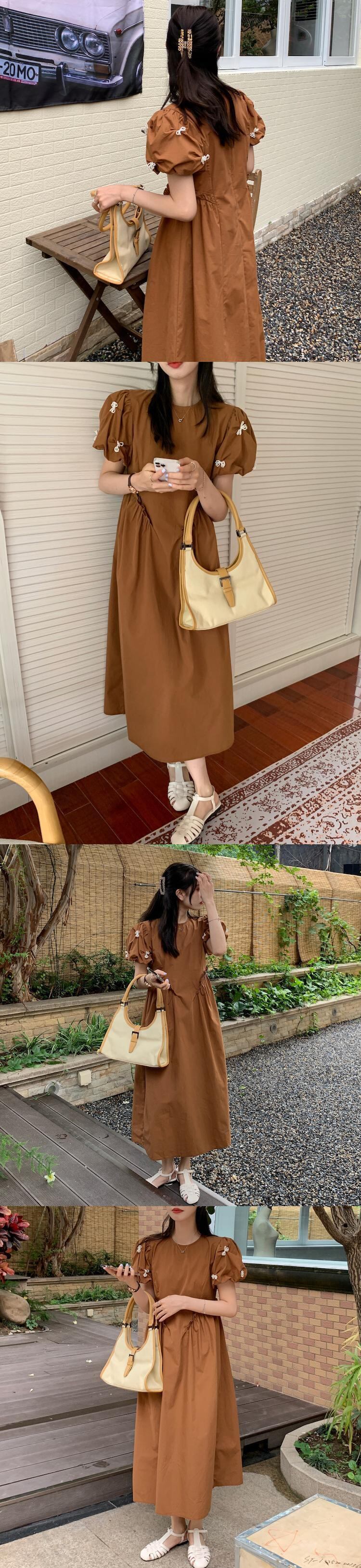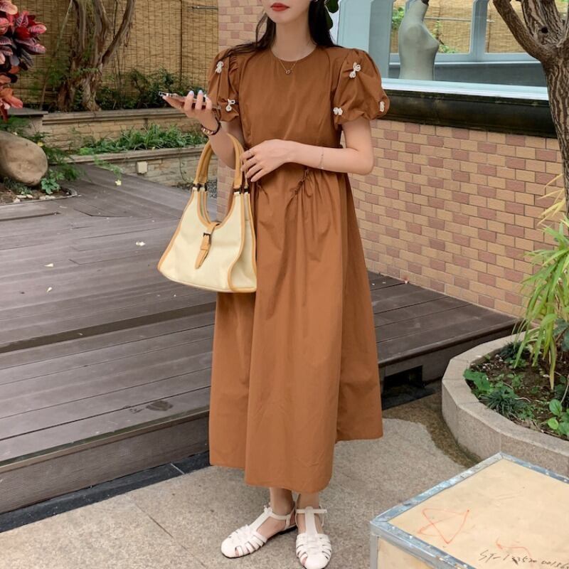 韓国ファッション夏服パールリボンロングハイウェストウェスト薄手ラウンドネックスリーブワンピースレディース エレガント 夏物 Oネック 真珠 ウエスト muzly20051328105 | Neatly