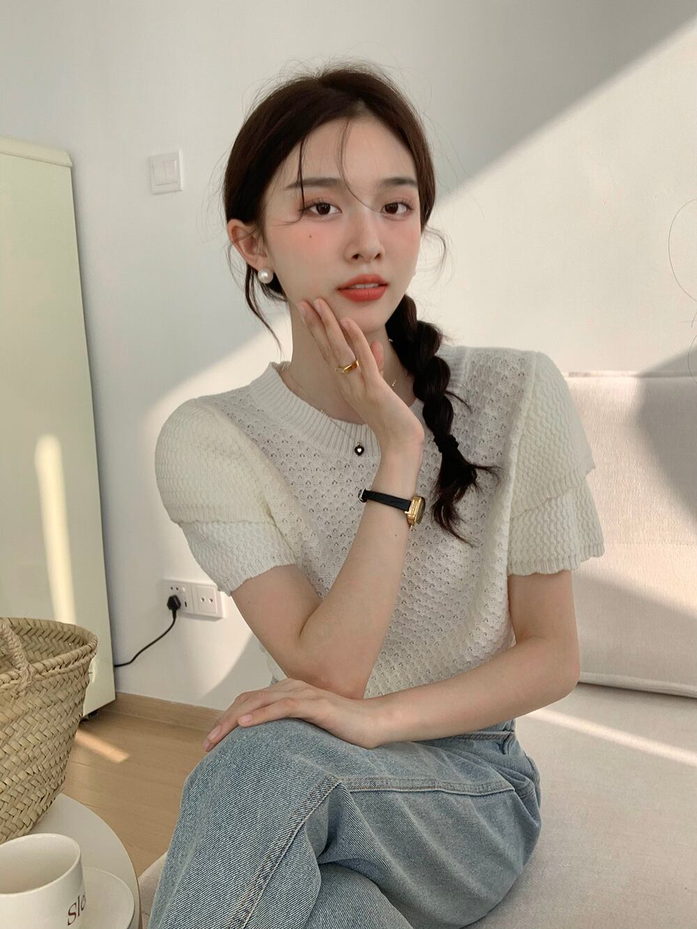 色:オフホワイトのセーター,フローラルキャミソール
