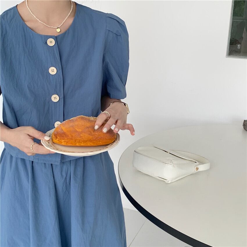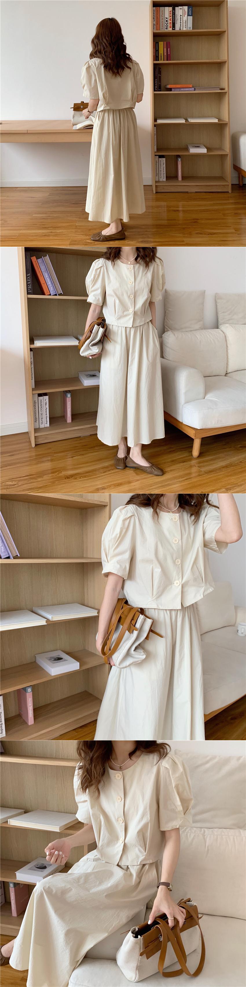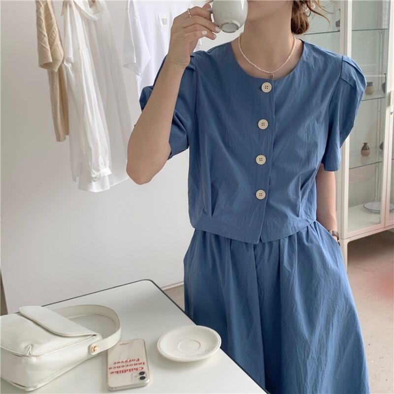 韓国ファッション夏服ラウンドネックショートスリーブシャツ ストレッチハイウェストウェストロングAラインスカート エラスティック 伸縮 夏物 Oネック ウエスト muzly61121966881 | Neatly