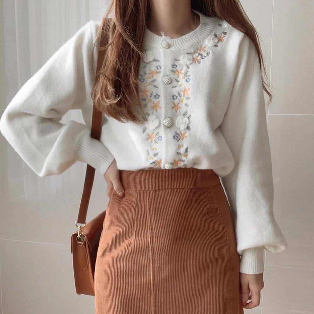 韓国ファッション秋物ウィンターパールボタン刺繍Flowerデザイン ニットカーディガンセーター ロング 大人ガーリー スウィート キュート カジュアル オータム 冬物 真珠 フラワーデザイン 長袖 muzly36021744931 | Neatly