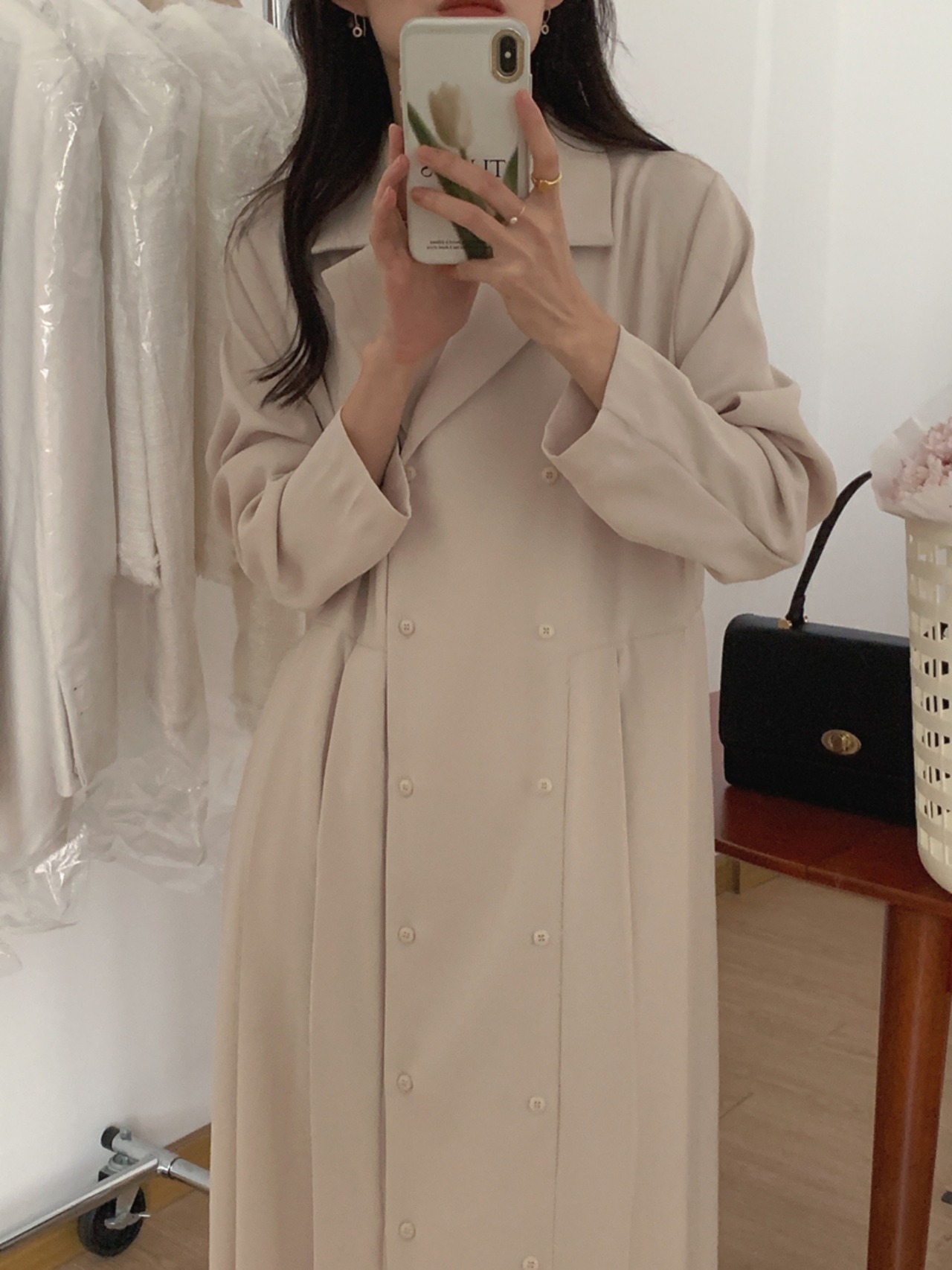 韓国ファッションスプリングスタンダードソリッド カラープリーツスカート ルーズダブルブレストワンピースレディース ロング レトロ 春物 ソリッドカラー 長袖 muzly98656269276 | Neatly