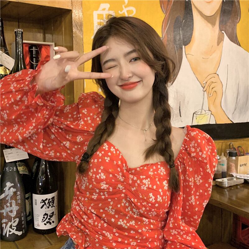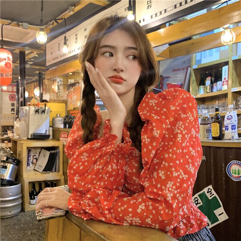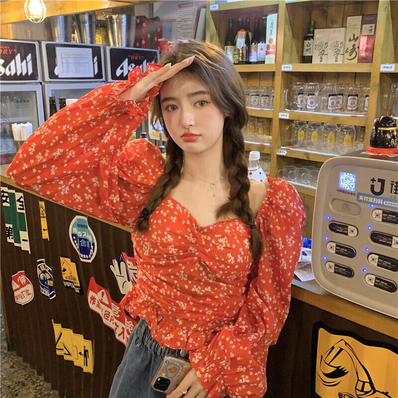 韓国ファッション秋物フローラルトップス ショートシャツ レディース ロング 大人ガーリー スウィート キュート カジュアル オータム 花柄 スクウェア 長袖 ウエスト muzly86756548098 | Neatly