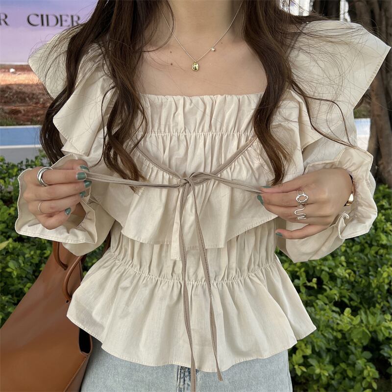 韓国ファッションスプリングカラープリーツウェストシャツ トップス レディース ロング 大人ガーリー スウィート キュート カジュアル 春物 スクウェア 長袖 ウエスト muzly72233135365 | Neatly