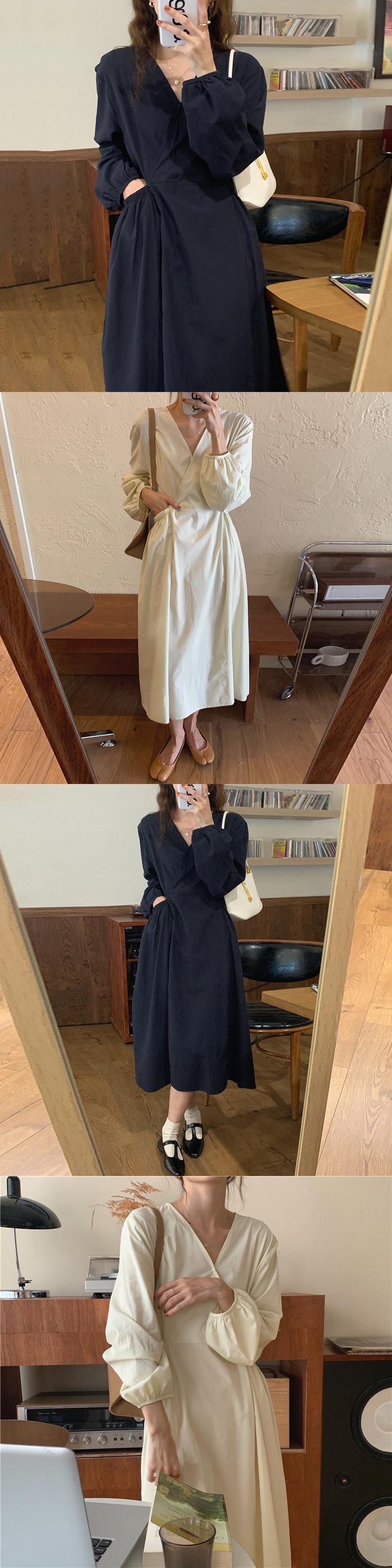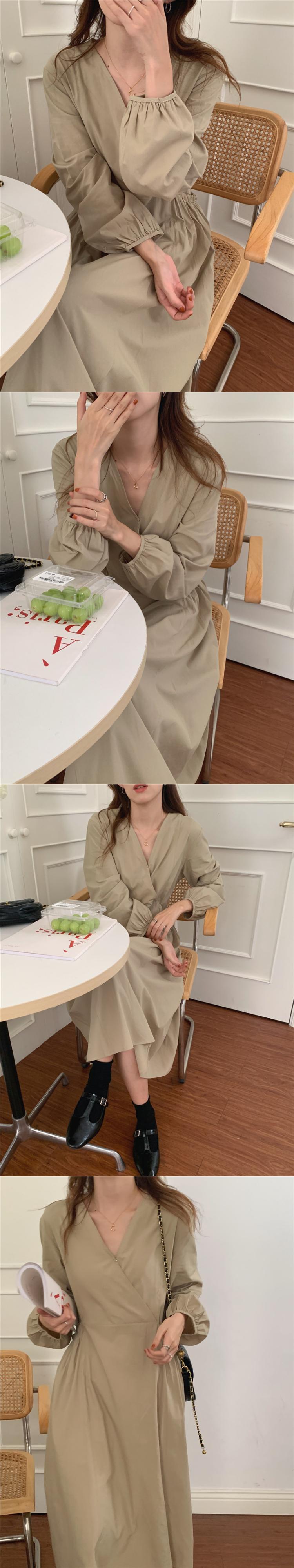 韓国ファッションNEW秋物Vネックポケットスリーブミディスカート ウェストスリムワンピースレディース ロング ランタンスリーブ オータム 長袖 ウエスト muzly34533180485 | Neatly