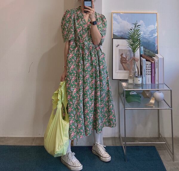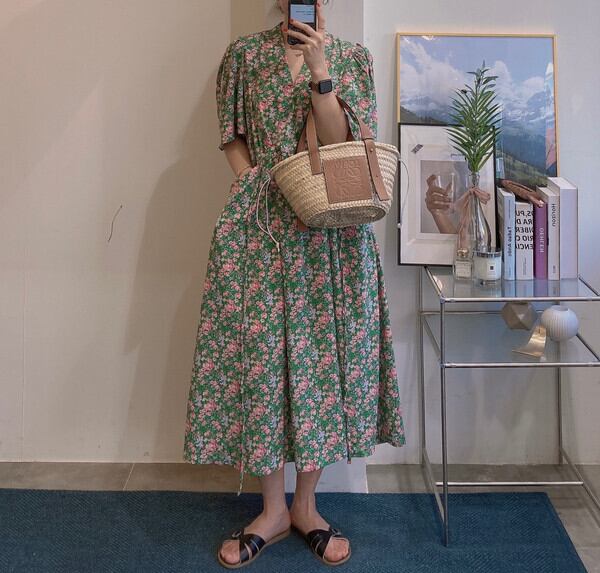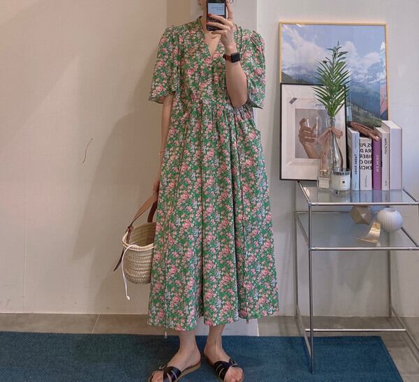 韓国ファッションNEW夏服Vネックフローラルスカート ロングレースウェストポケットミニ ワンピースワンピース 大人ガーリー スウィート キュート カジュアル 夏物 花柄 ウエスト muzly28034023684 | Neatly