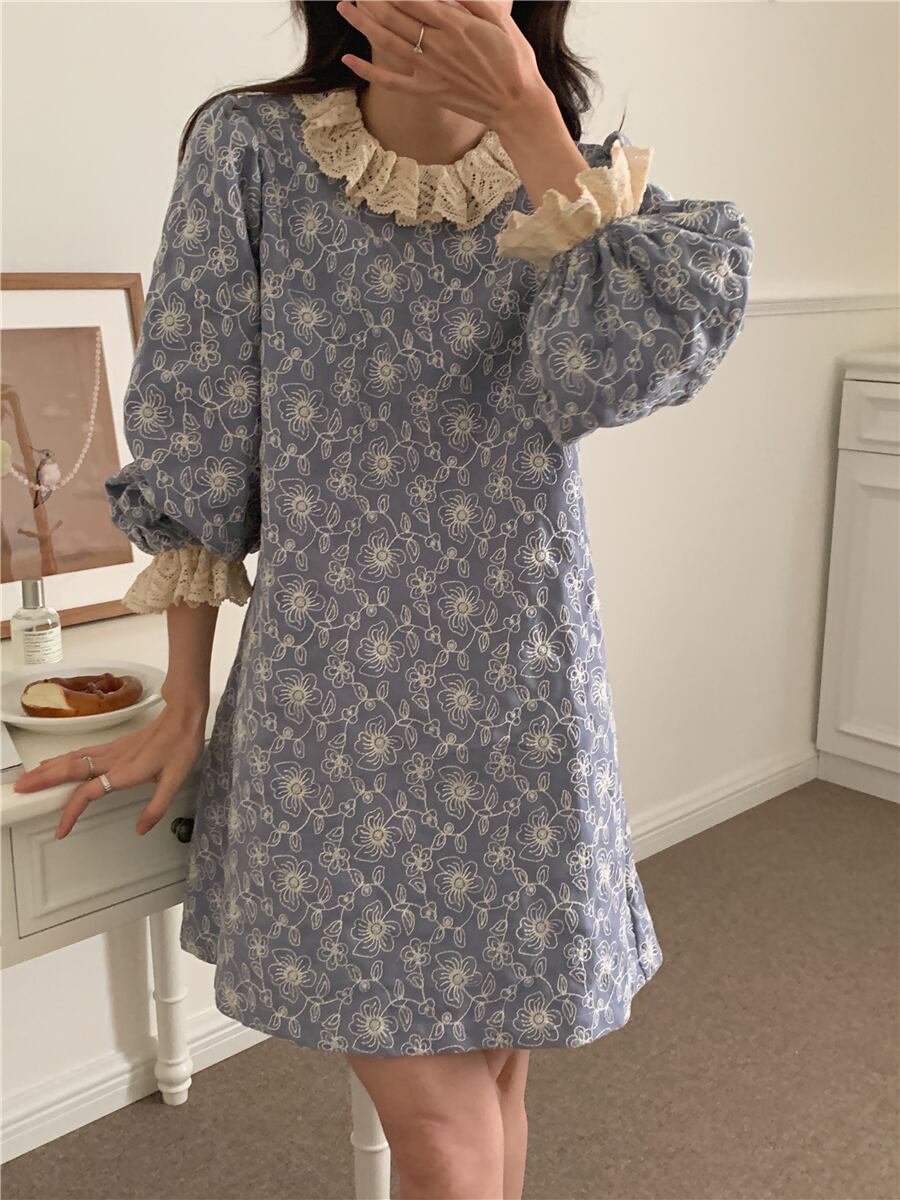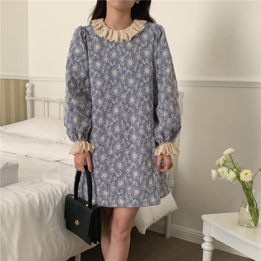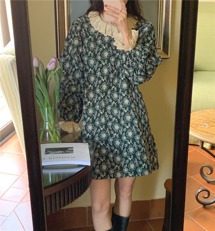 韓国ファッションスタンダードレースカラースリーブスカート Flowerデザイン ルーズワンピース レッド ランタンスリーブ レトロ 刺繍 フラワーデザイン ステッチ muzly12464922749 | Neatly