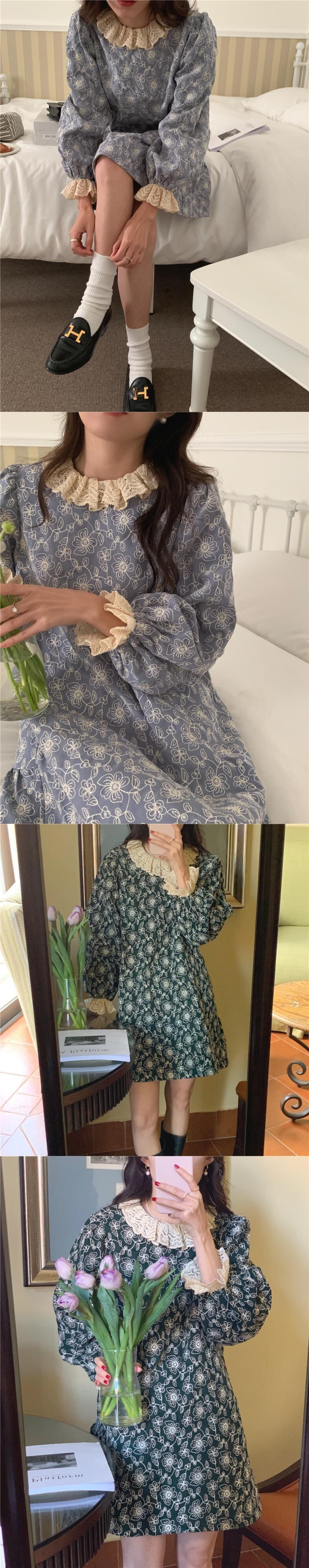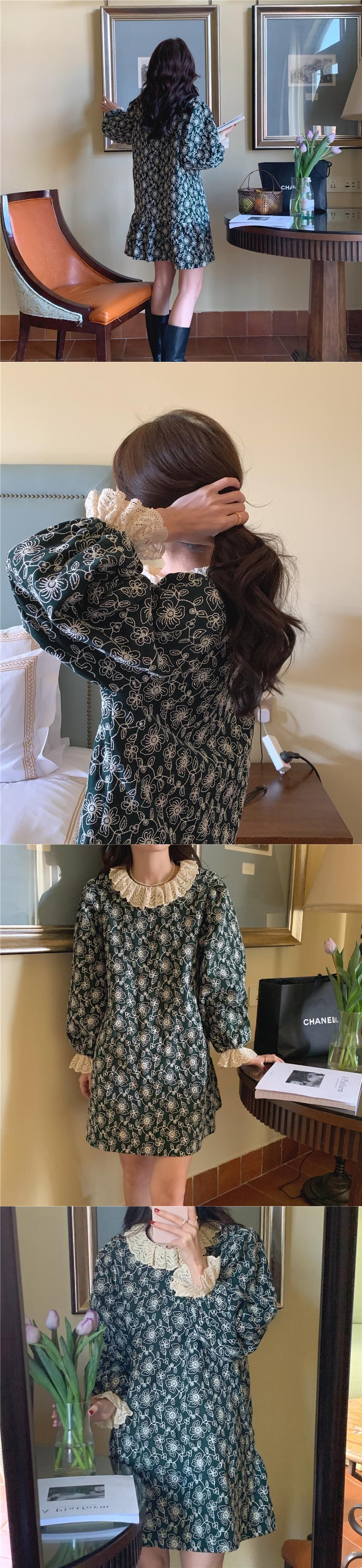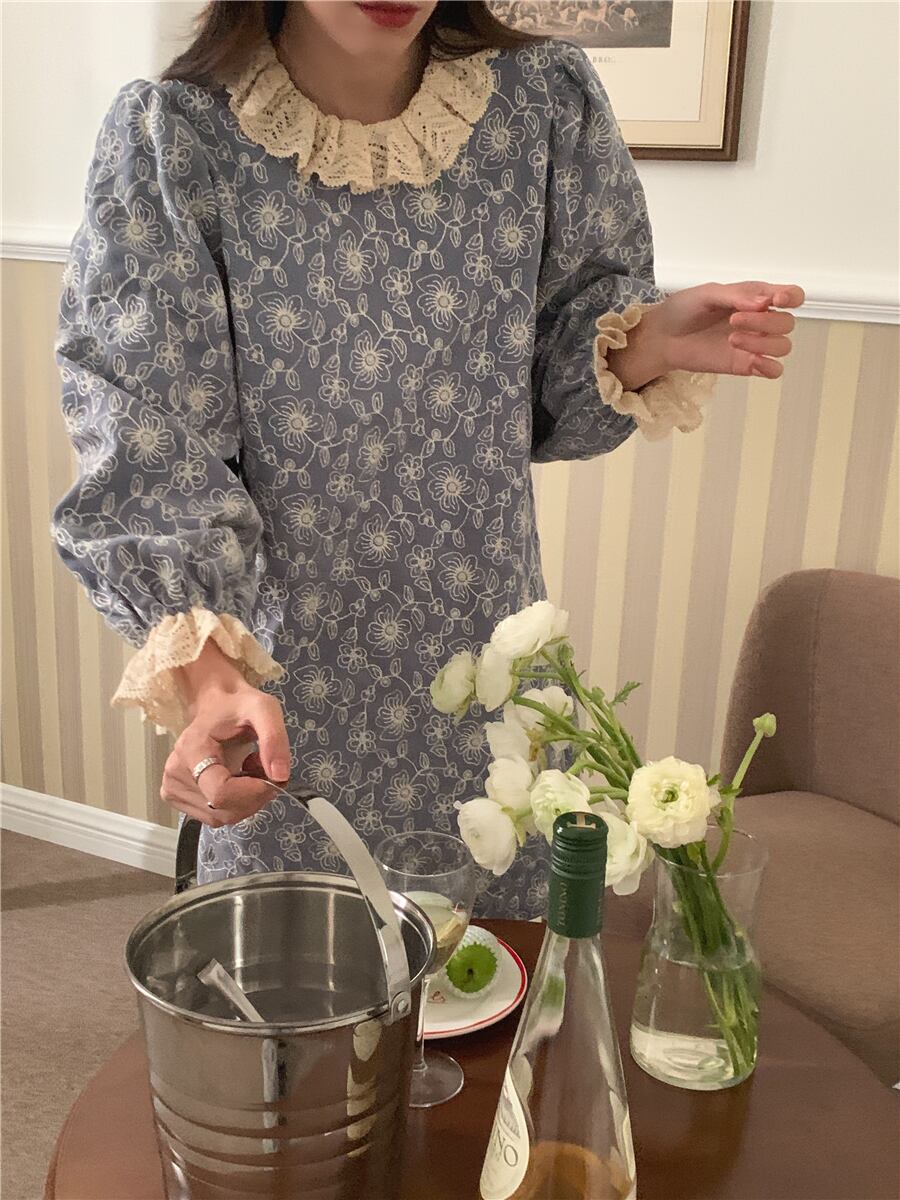 韓国ファッションスタンダードレースカラースリーブスカート Flowerデザイン ルーズワンピース レッド ランタンスリーブ レトロ 刺繍 フラワーデザイン ステッチ muzly12464922749 | Neatly