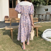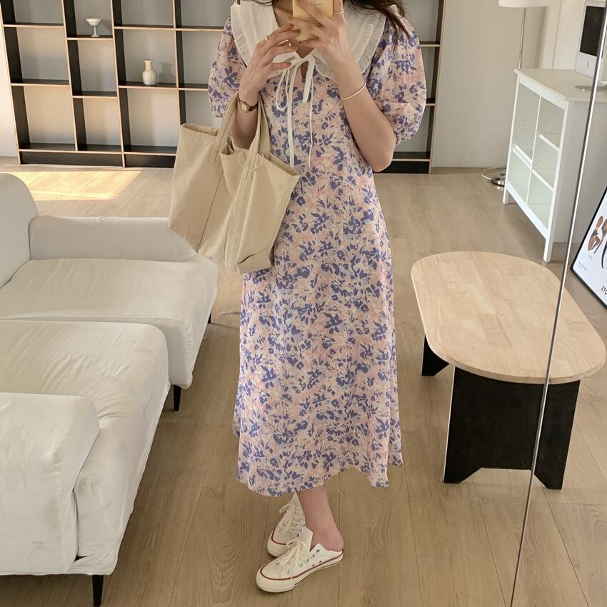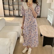 韓国ファッション夏服カラーロングフローラルスカート ウェストスリーブワンピース レース 大人ガーリー スウィート キュート カジュアル 夏物 花柄 レースアップ ウエスト muzly25792915969 | Neatly