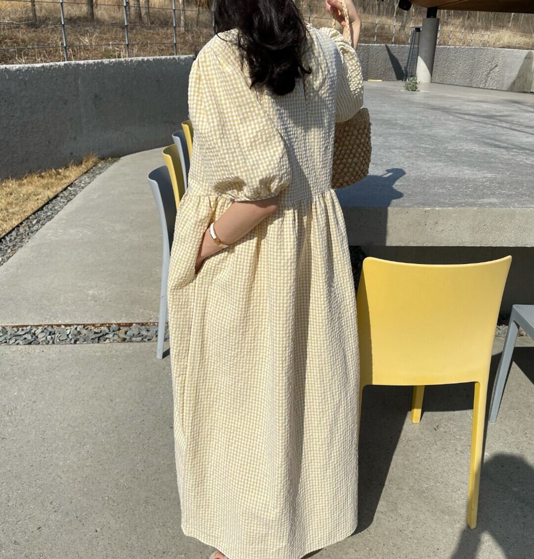韓国ファッション夏服ラウンドネックスタンダード格子柄スリーブルーズロングウェスト薄手半袖ワンピース ショート レトロ ハーフスリーブ 夏物 Oネック パフスリーブ ウエスト muzly9899923623 | Neatly