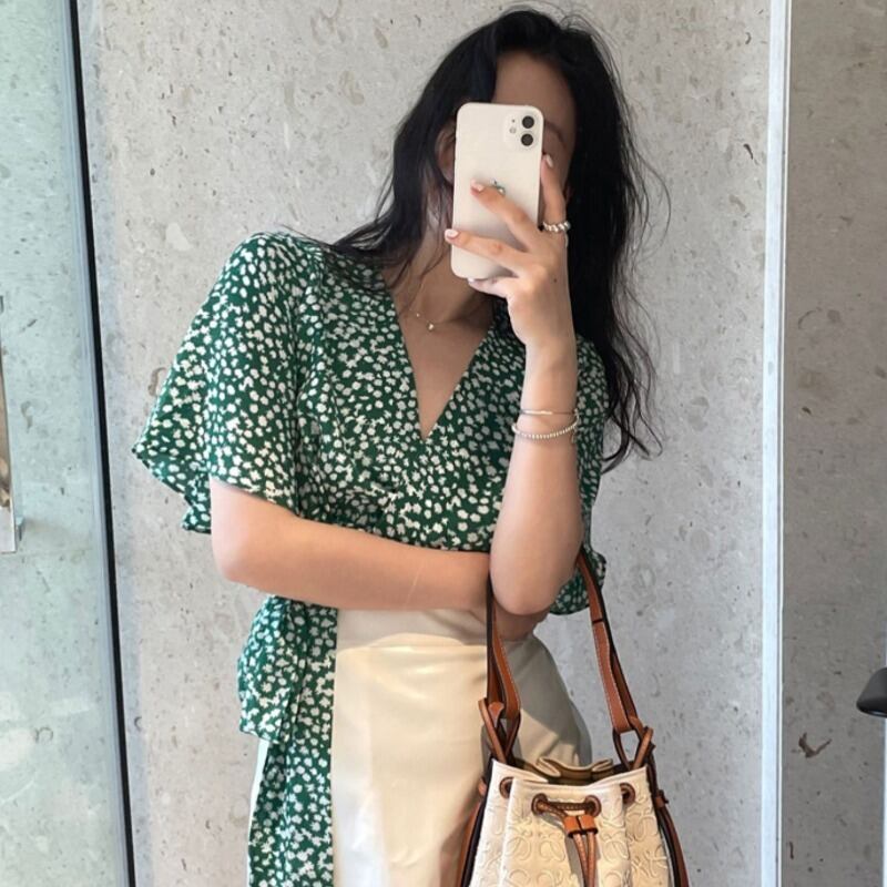 韓国ファッションNEW夏服Vネックショートストラップ ウェスト薄手Flowerデザイン シャツ トップス レディース 夏物 フラワーデザイン ウエスト muzly56076317711 | Neatly