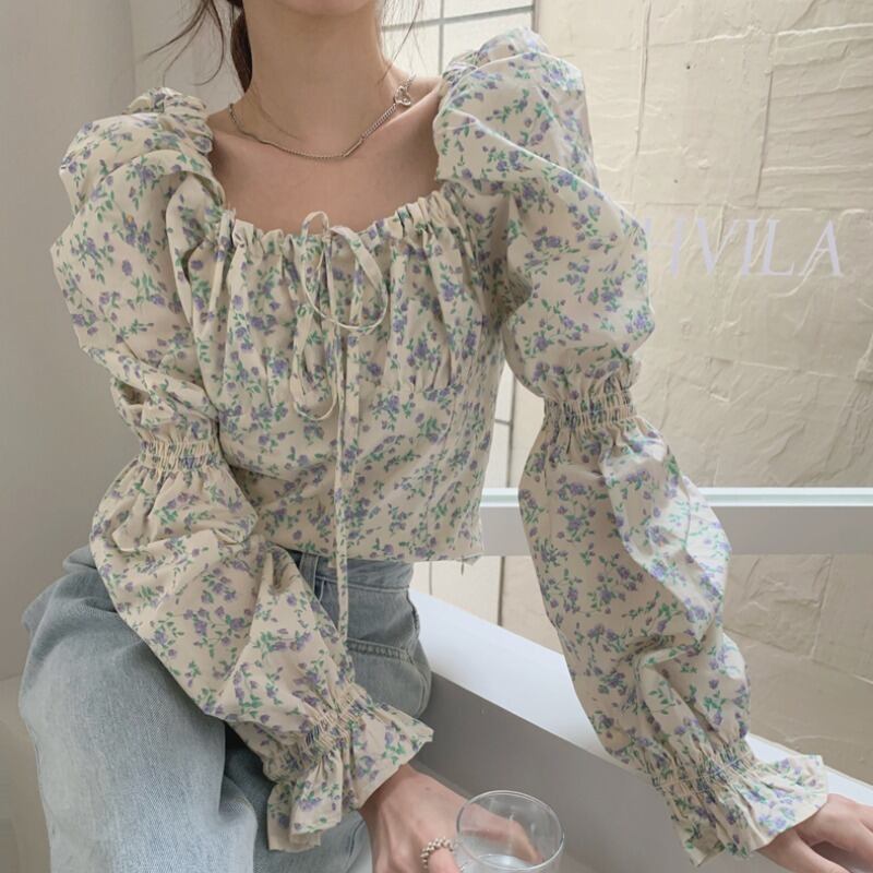 韓国ファッションスプリングカラーショート薄手Flowerデザイン スリーブシャツ レディース 大人ガーリー スウィート キュート カジュアル 春物 フラワーデザイン スクウェア muzly5907515850 | Neatly