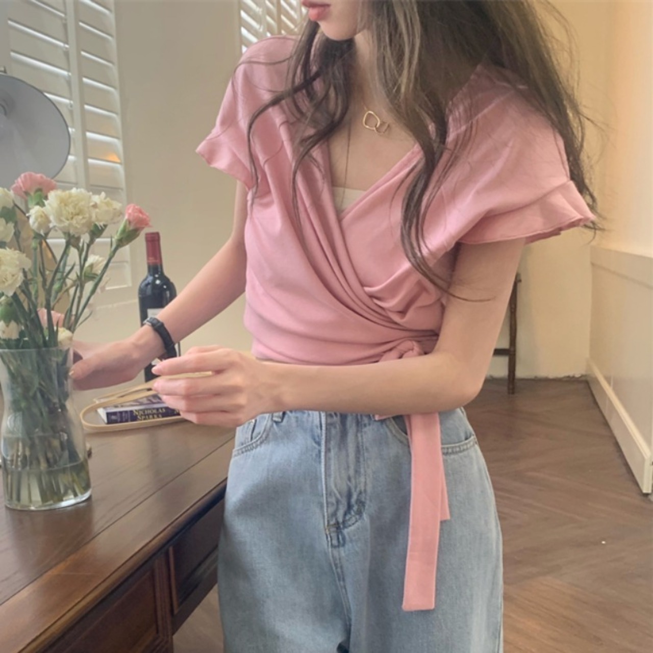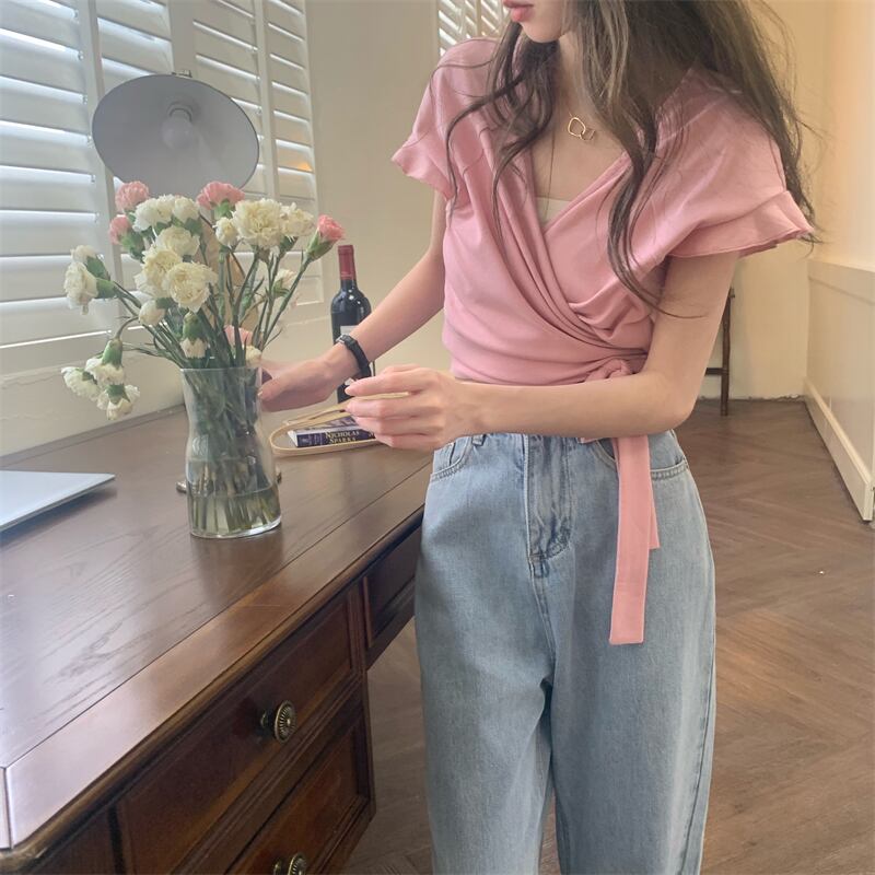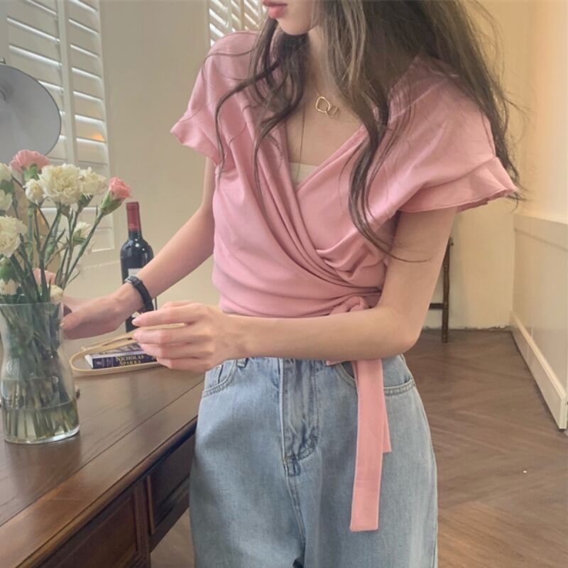 韓国ファッション夏服クロスVネックショートストラップ ウェストスリムスリーブTシャツトップス レディース 大人ガーリー スウィート キュート カジュアル 夏物 ウエスト muzly97993940930 | Neatly
